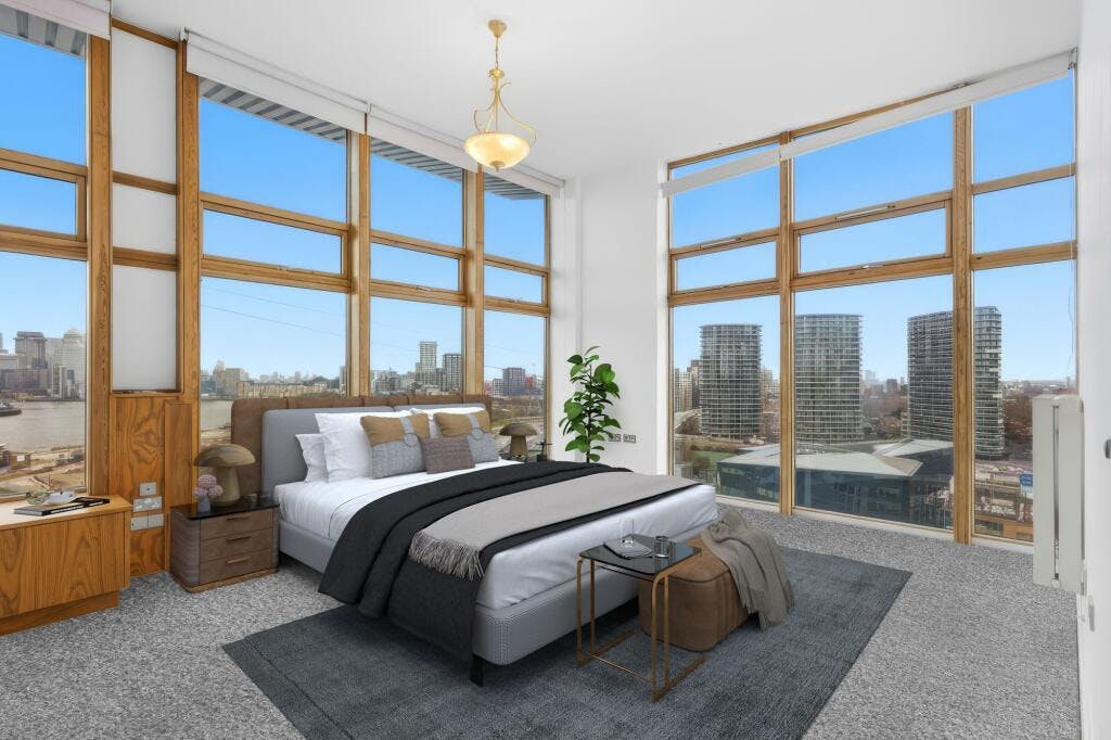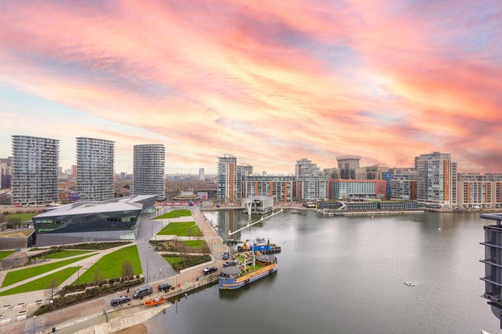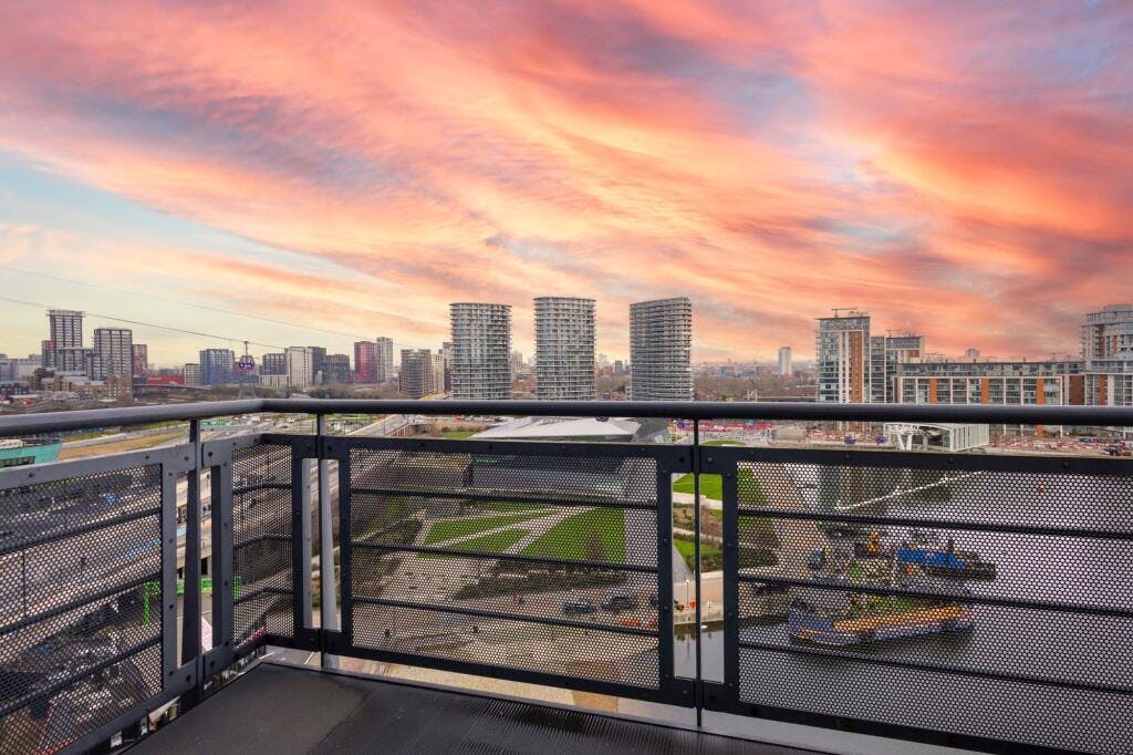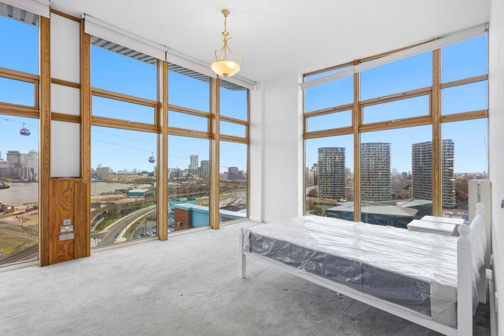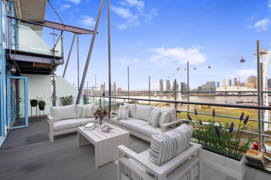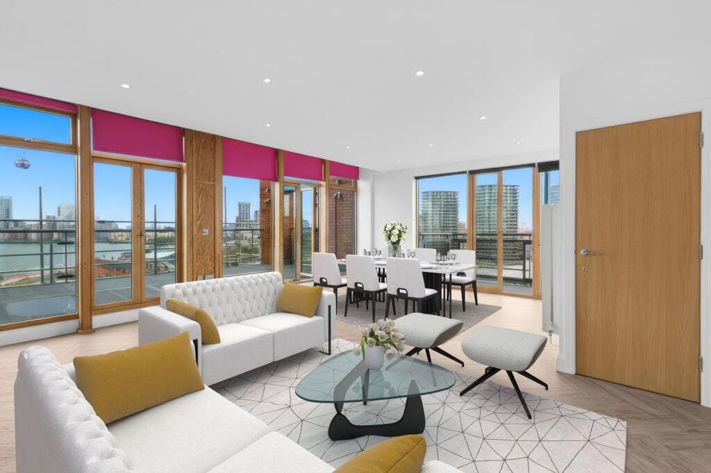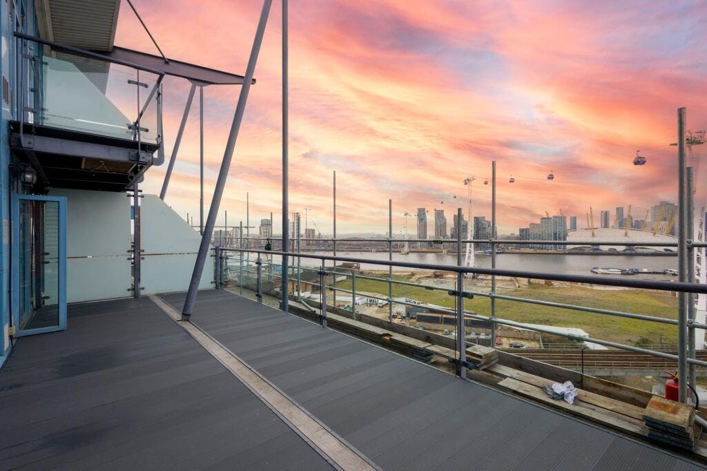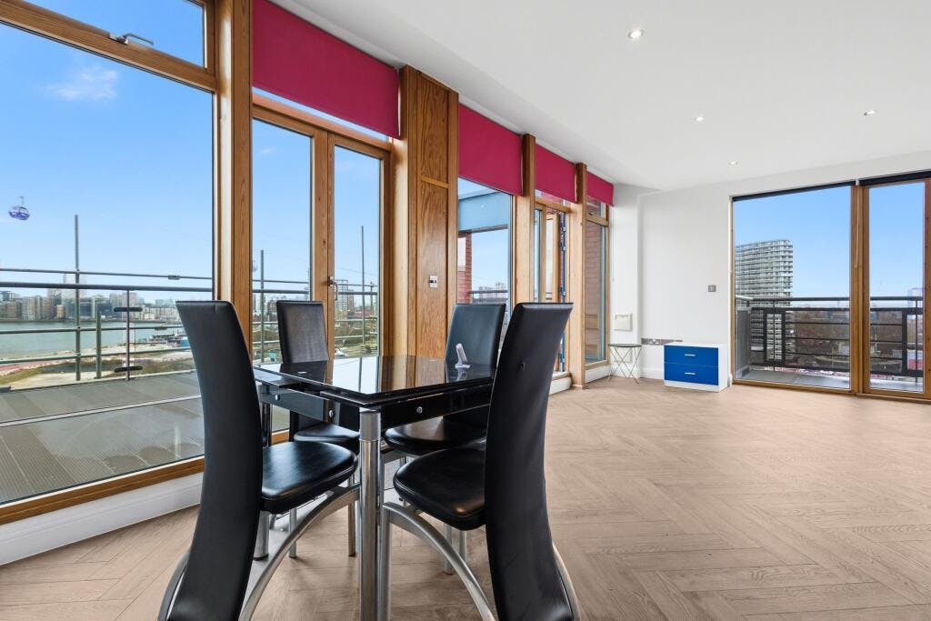 The standout feature is the substantial west facing terrace with open views across the water towards Canary Wharf, alongside two additional balconies providing multiple vantage points. The property also benefits from an underground parking space.