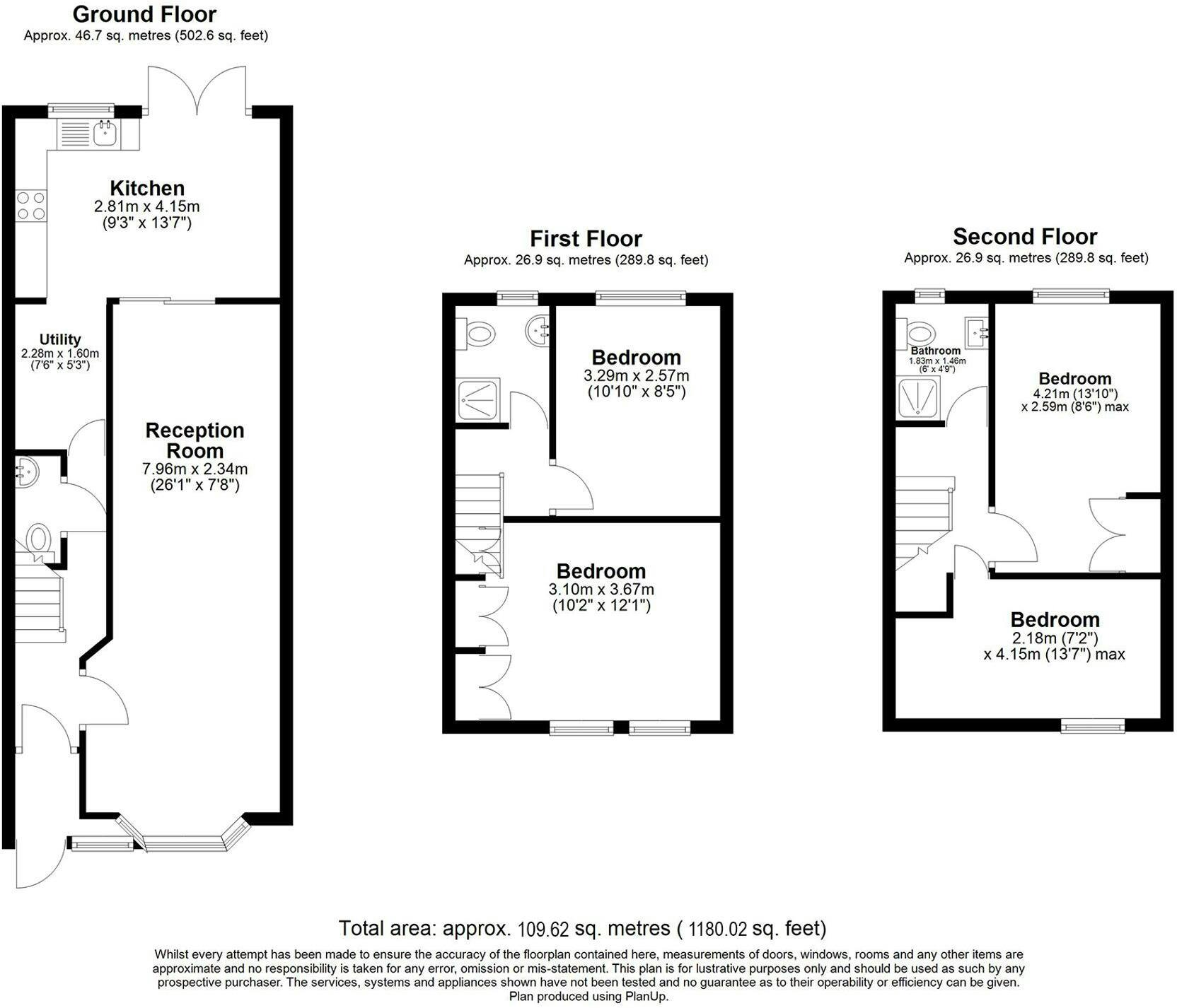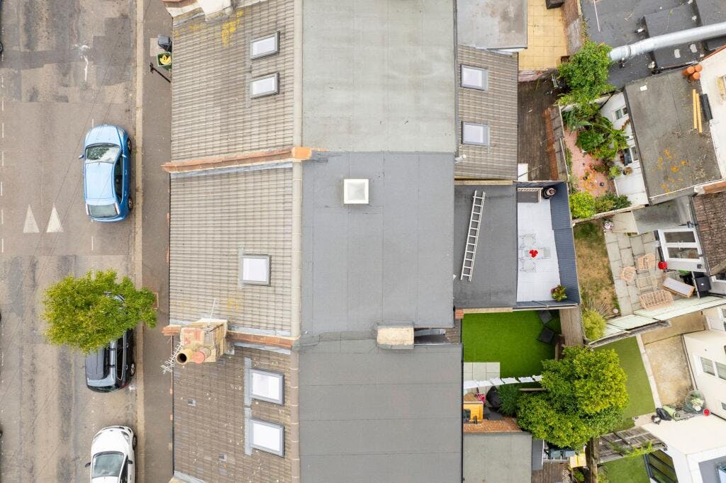 Two further bedrooms occupy the top floor, accompanied by a central bathroom. The arrangement allows for a potential principal bedroom suite, while the additional room can serve as a nursery, office, or guest accommodation.