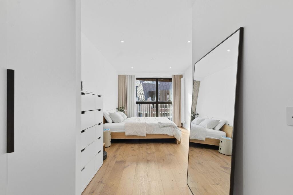 The bedroom is particularly impressive in scale. Exceptionally large and beautifully presented, it comfortably accommodates a king-sized bed and additional furniture with room to spare. There is clear potential to create a walk-in wardrobe or dressing area, making excellent use of the generous proportions.