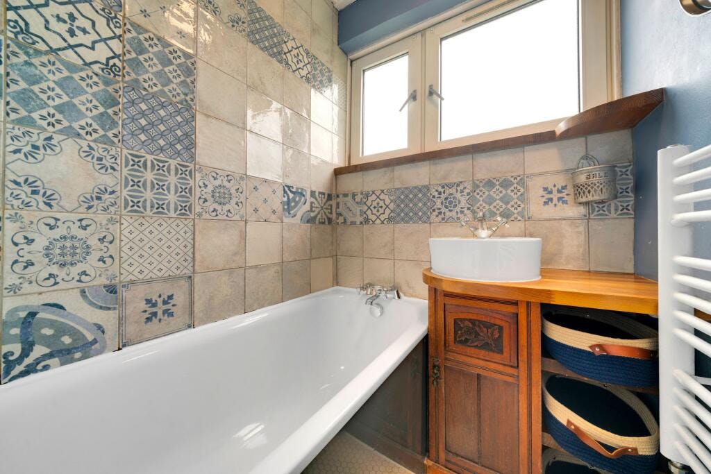 Upstairs are three comfortable bedrooms. The largest of the three spans over 14 feet in width, while the other two provide versatile options for guest rooms, home offices, or children's bedrooms. A contemporary family bathroom and an additional separate WC add to the functionality of this well-planned home.