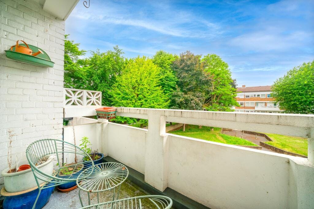 The living space features a bright and generously sized living/dining room with direct access to a private balcony overlooking the communal gardens. The open plan eat in kitchen is with ample worktop space and storage making it a practical hub for everyday living and entertaining.