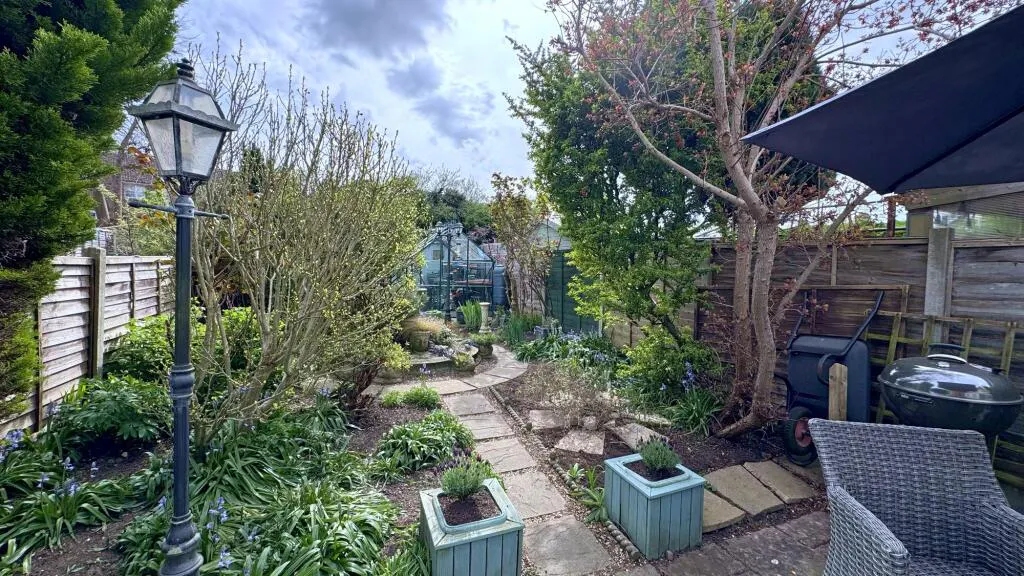 The south-facing garden is our true oasis. We love spending time in the conservatory in all weathers, and hosting barbecues on the patio when the sun is out. It's a wonderful space for entertaining. The garden itself is what I'd call an urban cottage garden: a mix of small trees and shrubs that attract all kinds of birds year-round. There is always something in bloom, as we've planted with every season in mind. We feel incredibly lucky to have such privacy here — the large trees at the back offer a real sense of seclusion, which is rare for a location like this. There's also the bonus of an extra parking space.