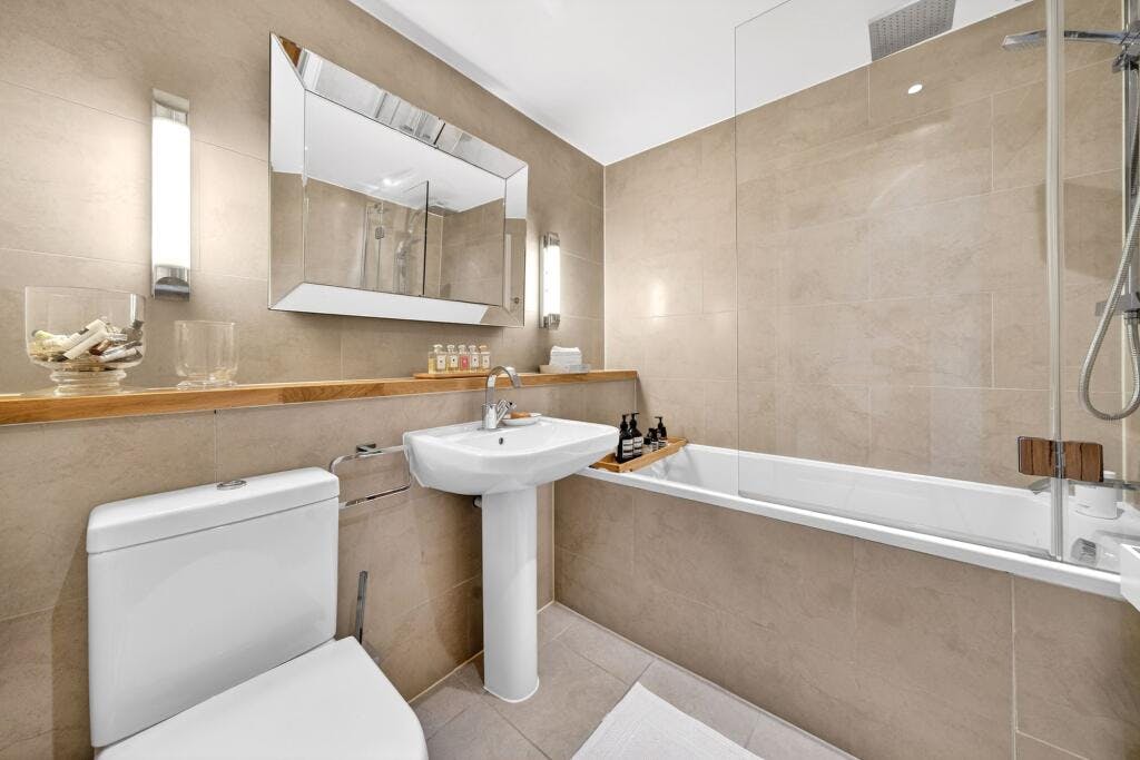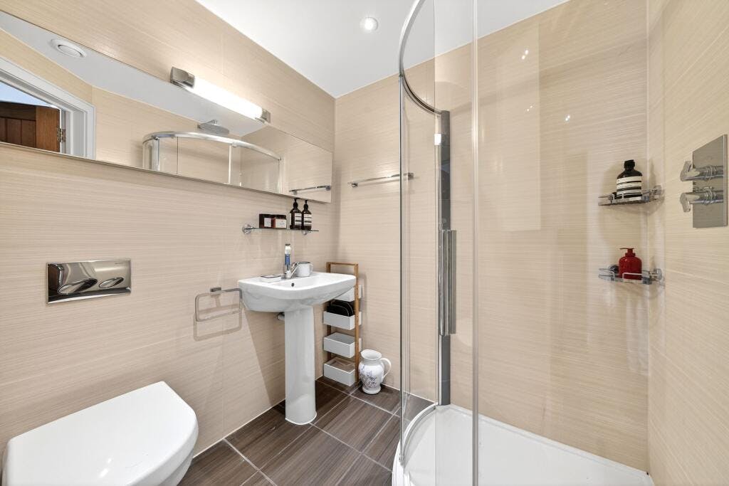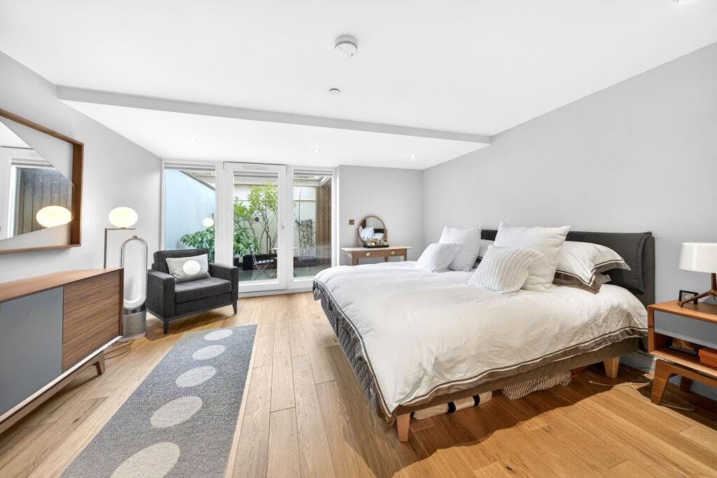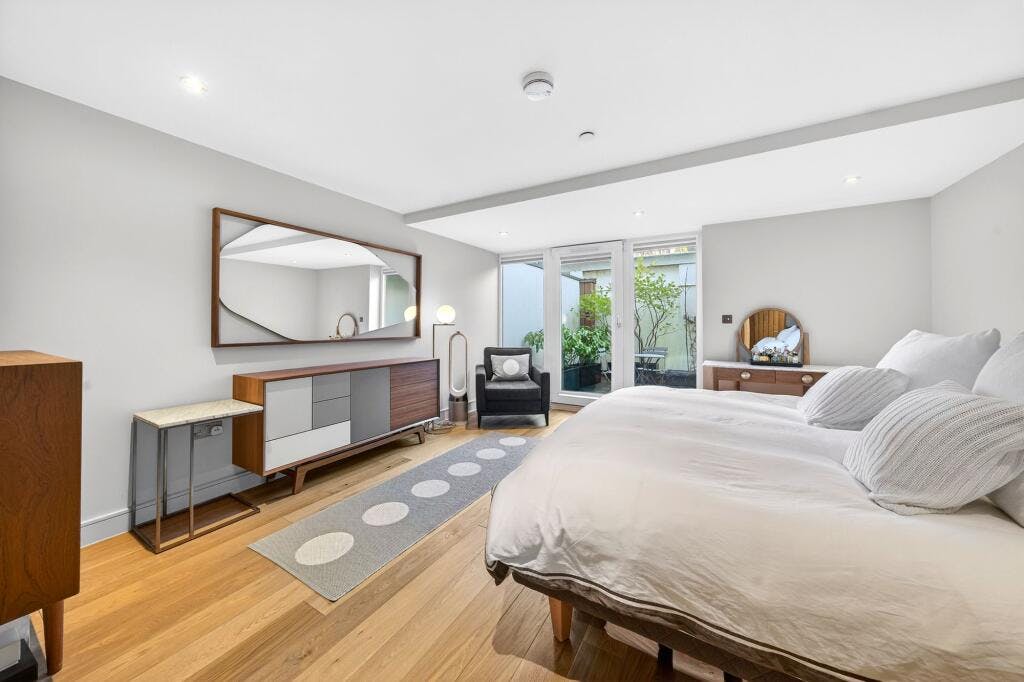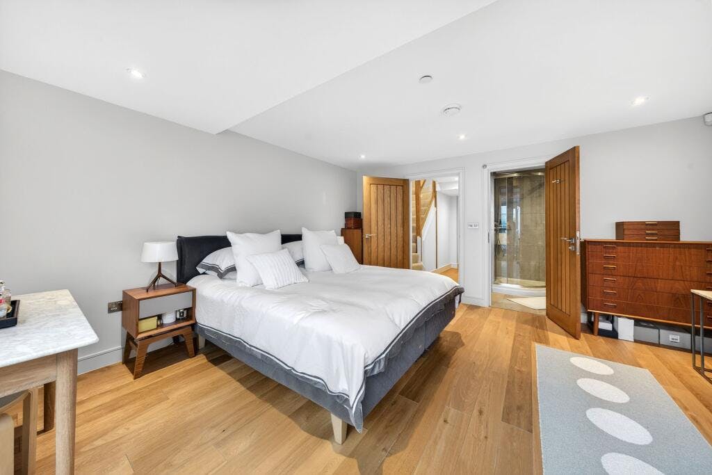 The second-floor mezzanine level provides a versatile additional area, perfect as a TV room, home office or playroom. On the ground floor there are two double bedrooms, each with an en-suite bathroom, along with excellent storage. The lower level comprises a further double bedroom with en-suite and a superb principal suite featuring an en-suite bathroom and direct access to a private patio garden.