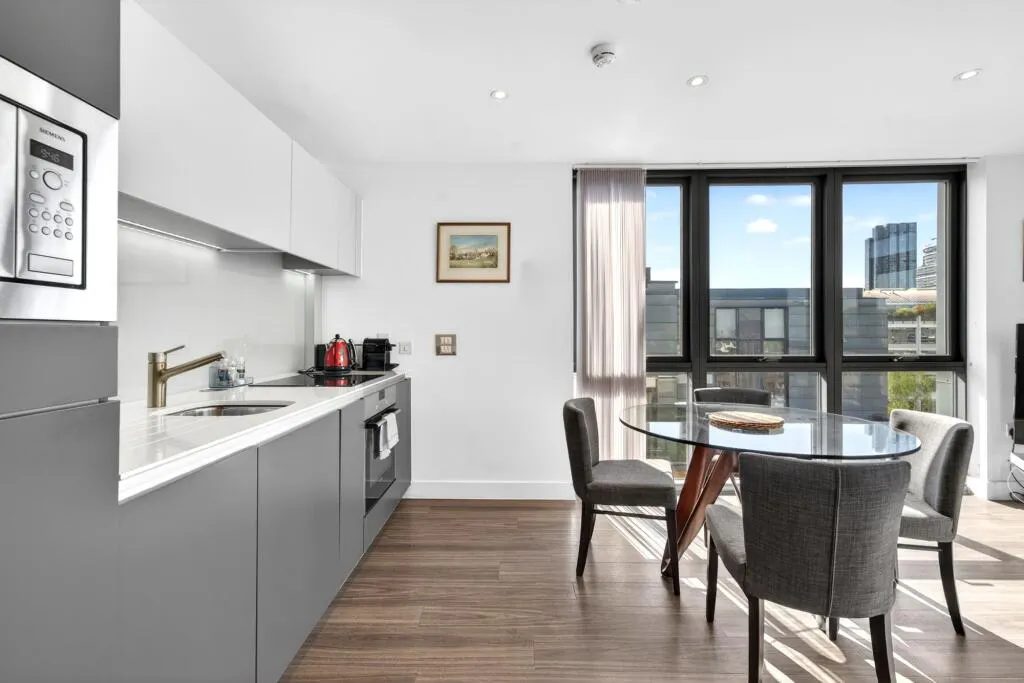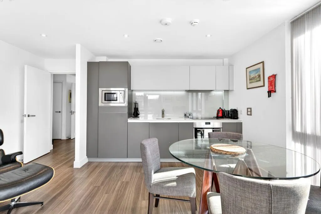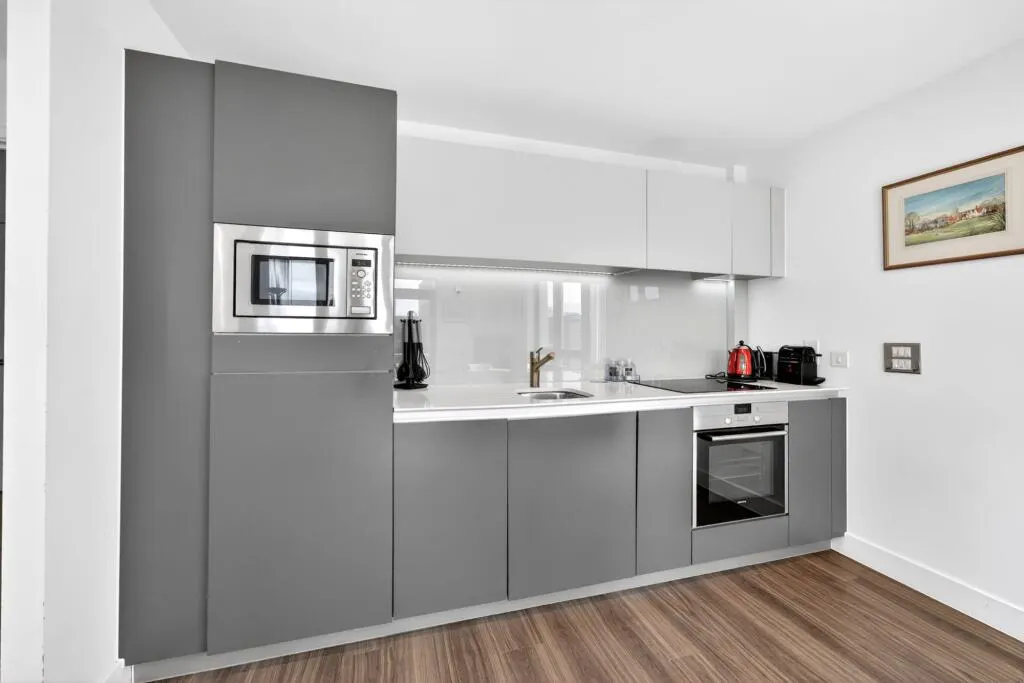 The main living space provides an excellent setting for both relaxing and entertaining, with clearly defined areas for cooking, dining and seating. Large windows on two aspects create a wonderfully bright and airy feel, enhancing the sense of space and giving the apartment a warm, welcoming atmosphere. The private balcony adds a valuable outdoor extension to the living space, offering the perfect spot to sit and unwind. The kitchen is smartly finished with modern cabinetry and integrated appliances, combining practicality with a sleek contemporary look.
