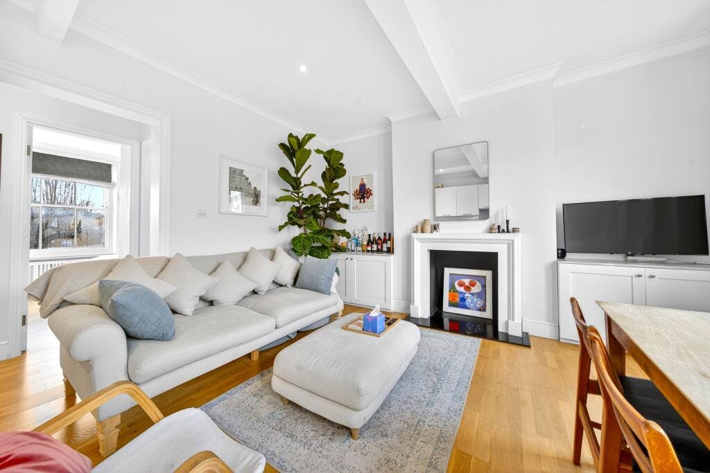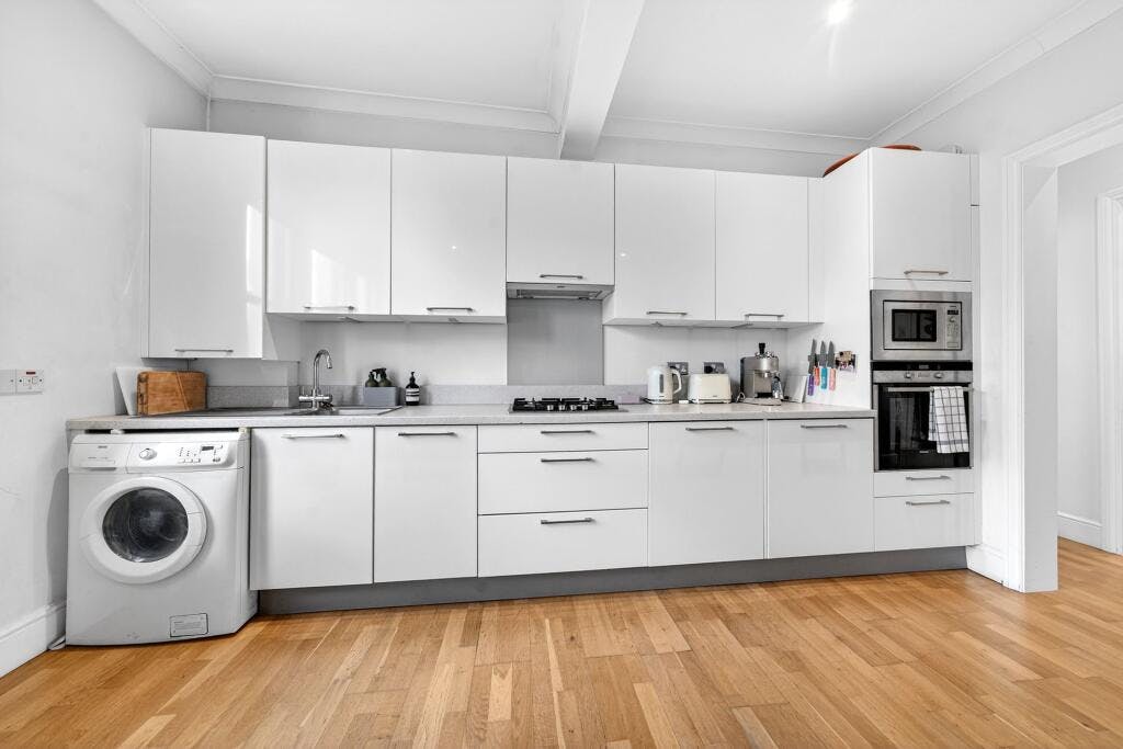 Positioned in a quiet, leafy setting and set back from the main road, the home feels wonderfully peaceful while remaining brilliantly connected. To the front of the apartment, a spacious open-plan living area is flooded with natural light, creating a welcoming space to relax, dine and entertain. The apartment is complemented by a modern fitted kitchen and a contemporary bathroom, both finished to a smart, clean-lined standard. The building itself is beautifully maintained, with a strong sense of community and many long-term owners.