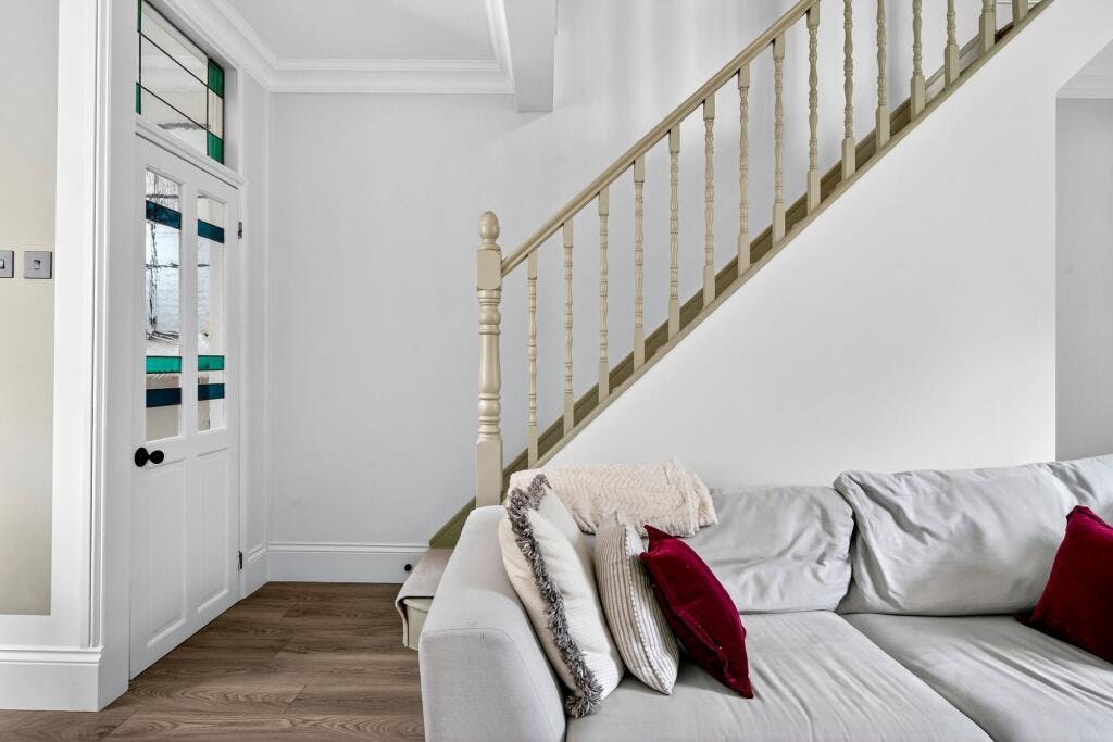 Recently refurbished to a high standard, this elegant three-bedroom split-level maisonette combines generous proportions with refined period detail. An entrance lobby leads to a superb open-plan reception/dining room with cast-iron fireplace and French doors opening to a raised deck and newly landscaped private garden, complete with outdoor kitchen and extensive covered decking.