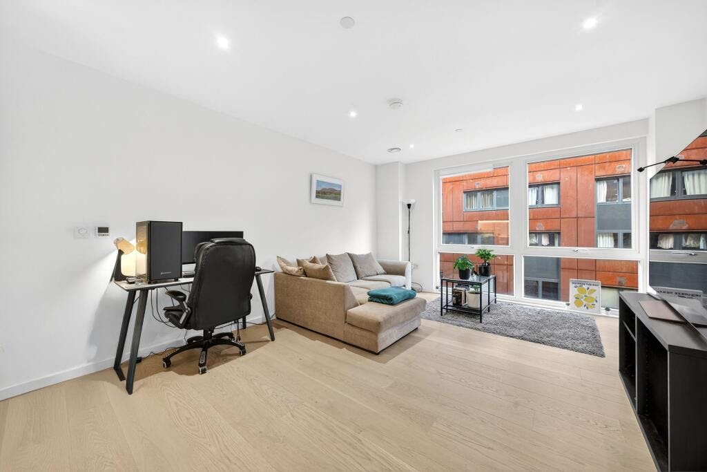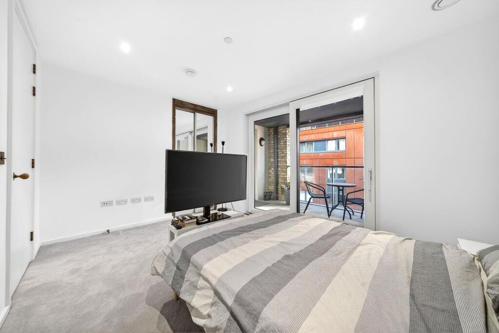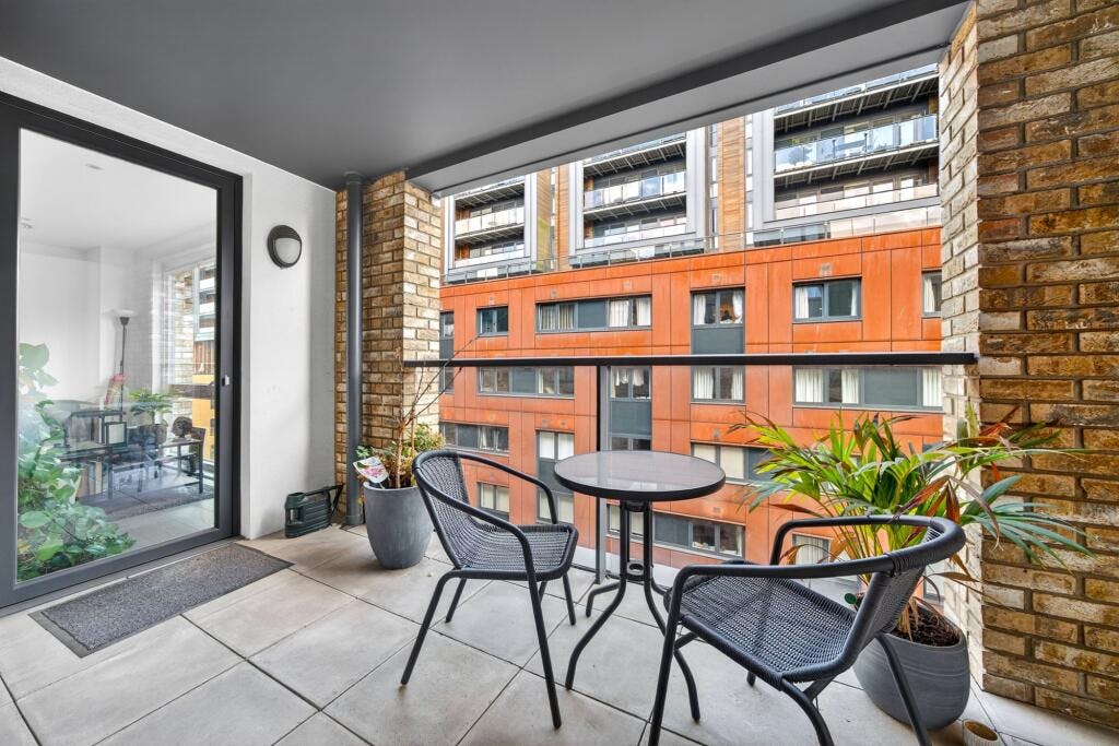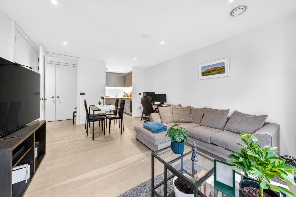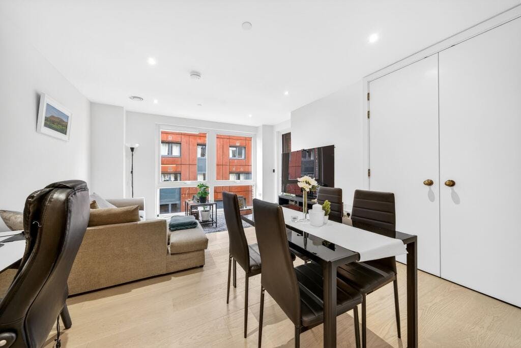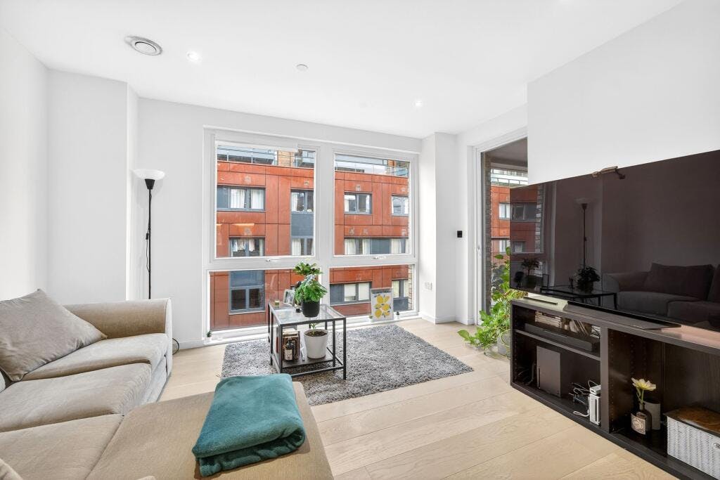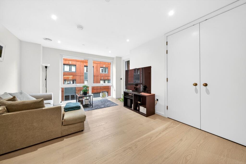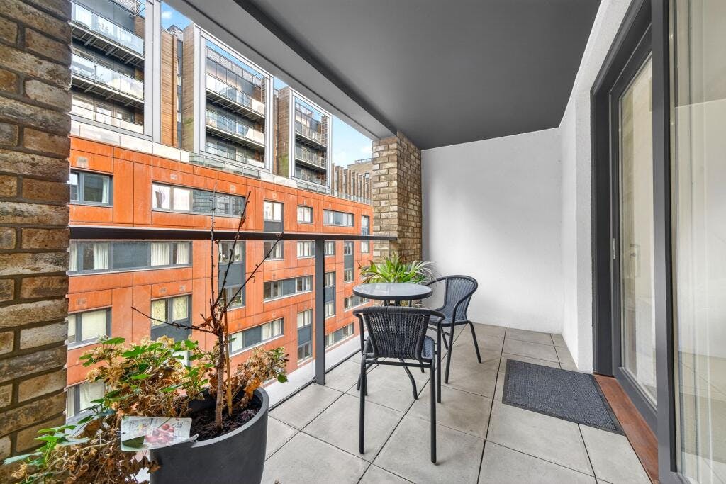 Set within the sought after Crest Building, this superb one-bedroom modern apartment (570 sq. ft.) is presented in excellent condition and enjoys a private covered balcony with direct access from both the open-plan living space and the double bedroom. Positioned on the fourth floor of a secure development in a highly convenient N1 / Angel–Islington location, the flat offers a generous, well-proportioned layout with high ceilings and large windows that flood the home with natural light.