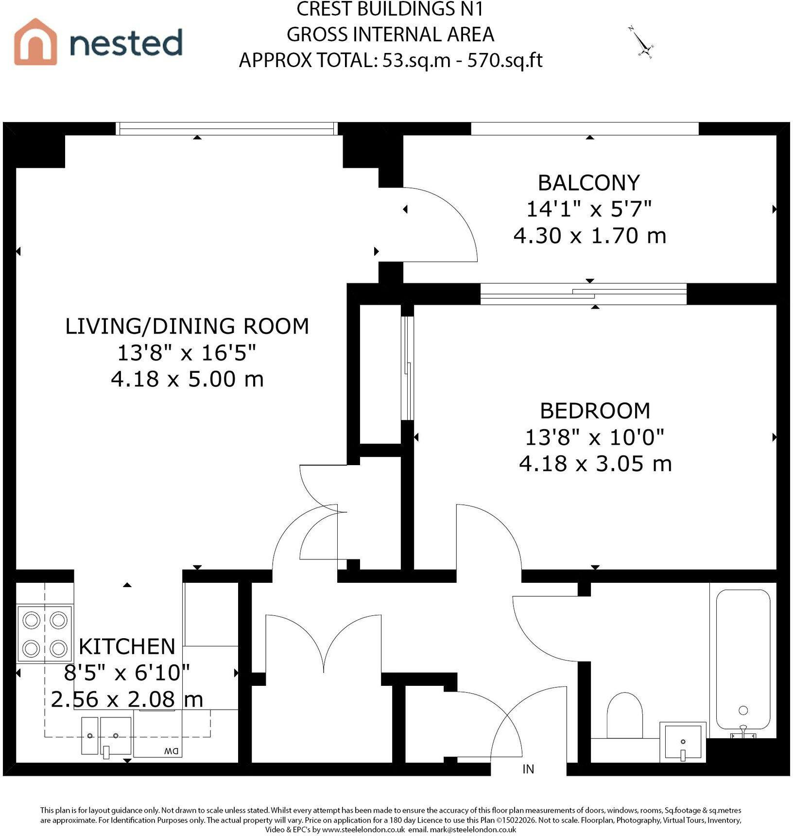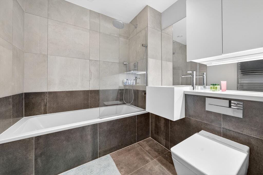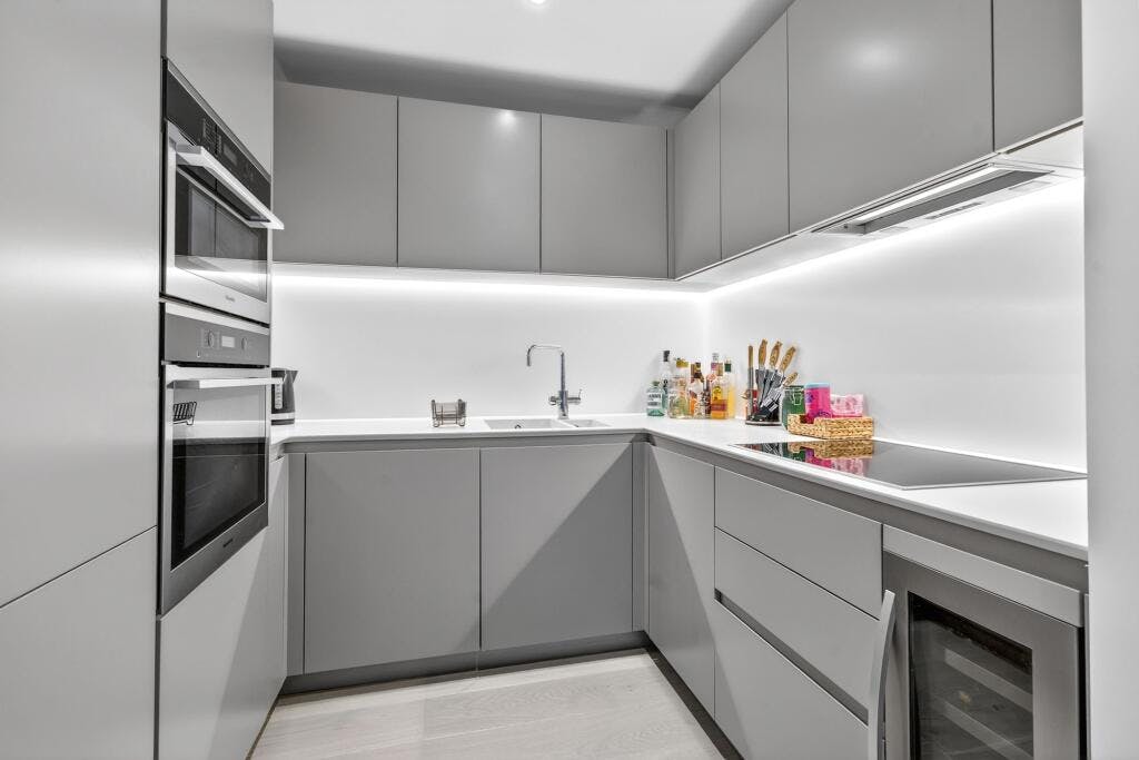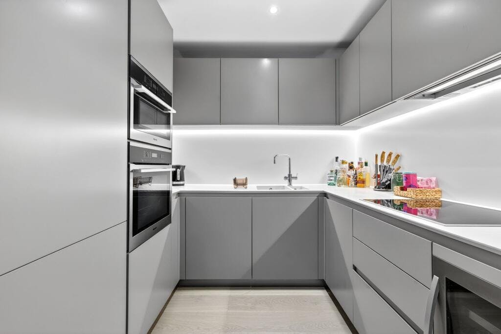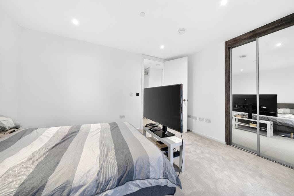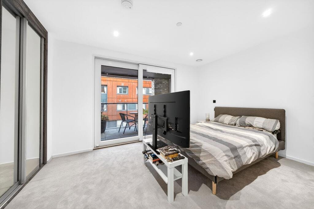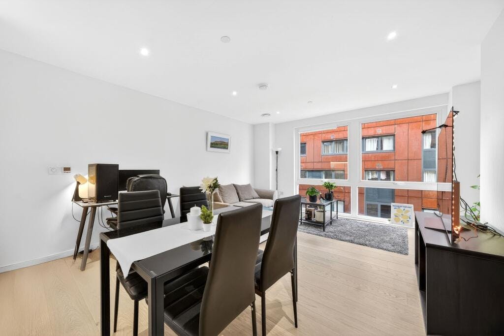 Set within the sought after Crest Building, this superb one-bedroom modern apartment (570 sq. ft.) is presented in excellent condition and enjoys a private covered balcony with direct access from both the open-plan living space and the double bedroom. Positioned on the fourth floor of a secure development in a highly convenient N1 / Angel–Islington location, the flat offers a generous, well-proportioned layout with high ceilings and large windows that flood the home with natural light.
