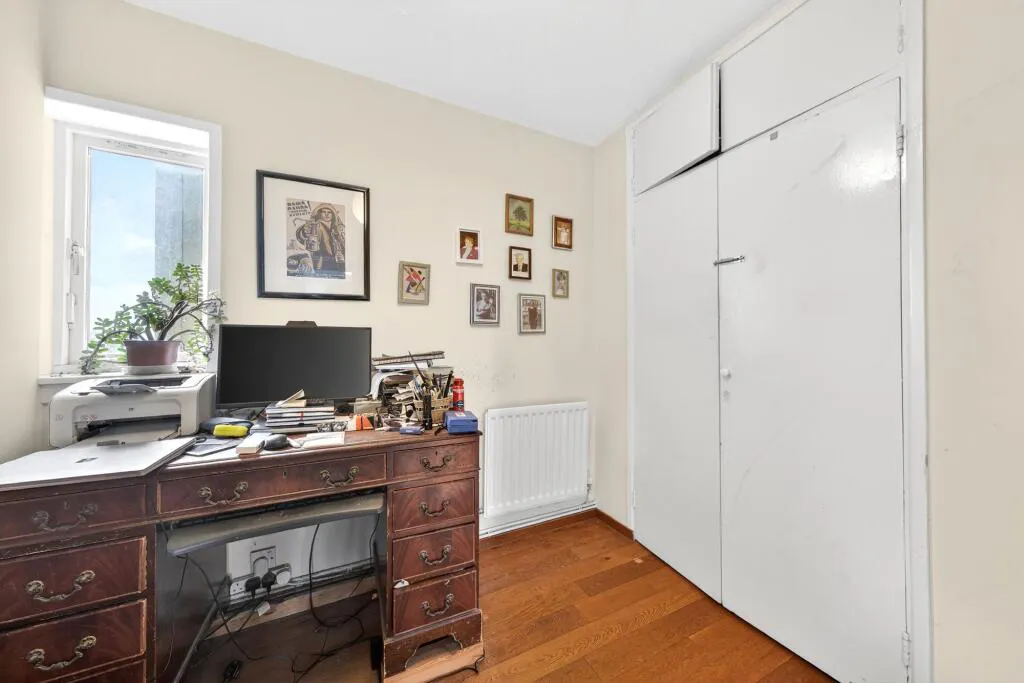 The dual aspect reception room is a good size and further benefits from built-in storage.