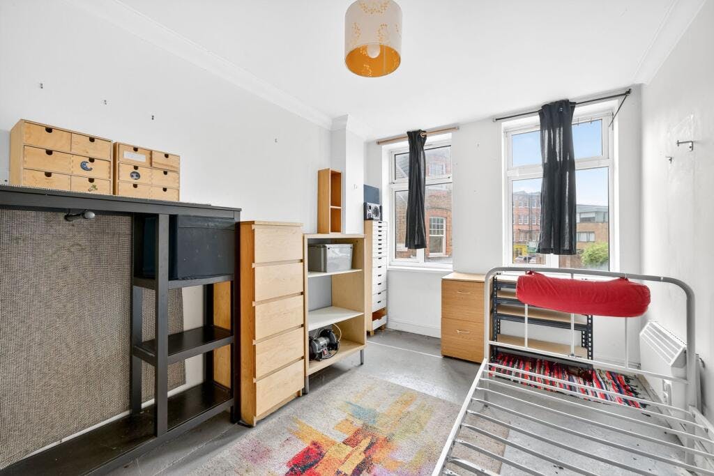 Similar to the reception room, the bedroom has two large windows, making it lovely and light. There is space for a double bed and a wardrobe, plus a chest of drawers.