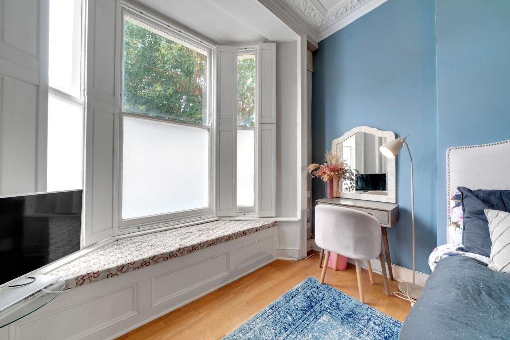 The high ceilings and the original features make this flat feel really special, especially the beautiful large bay window and ornate ceiling rose in the bedroom. It’s also incredibly rare to find a one-bedroom flat that’s this spacious and has so much built-in storage, to the point that I even have a mini utility room. The finish is high-spec throughout, including underfloor heating in the bathroom so it’s completely move-in ready with no work needed. Having a private, south-facing garden with no neighbours backing onto it was a huge bonus. It feels like a little oasis in North London and makes the property feel even bigger. Despite being between two main roads, Thane Villas is genuinely the most peaceful street I’ve ever lived on.