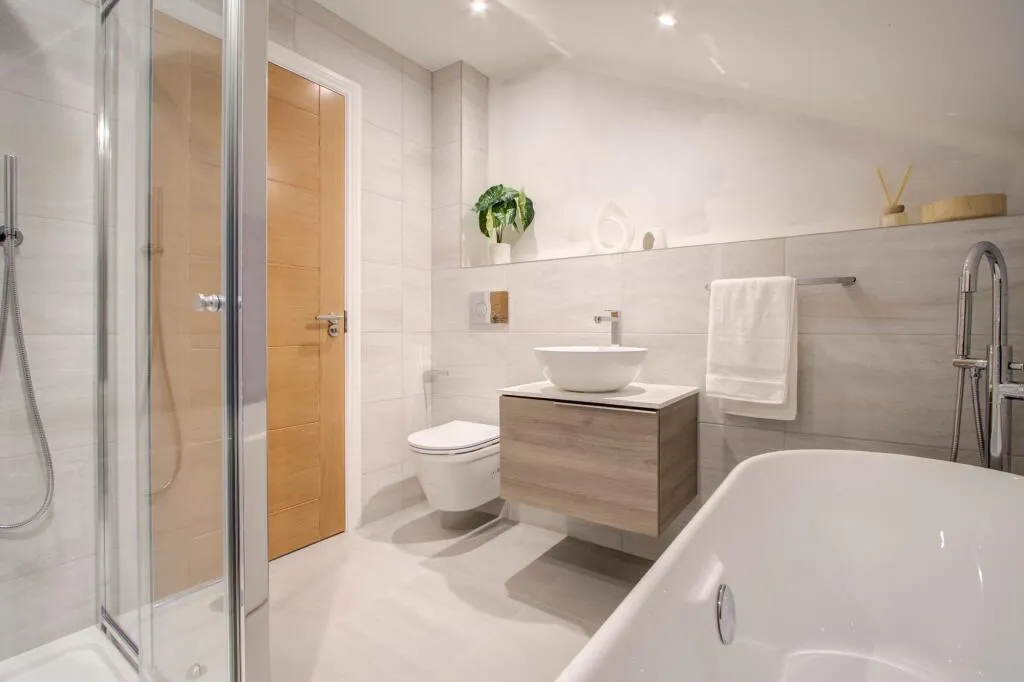 The primary suite offers a peaceful retreat with its own included fitted dressing room and a luxurious en-suite, featuring a rainfall shower, and Porcelanosa fittings and tiles. Two further double bedrooms and a family bathroom, complete with a freestanding bath, separate shower, and heated towel radiators in both bathrooms, complete the first floor.