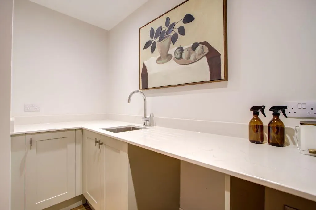 At the heart of the home, the spacious open-plan kitchen and dining area includes a breakfast bar, integrated AEG appliances, and luxurious solid worktops. Elegant aluminium bi-folding doors open seamlessly onto the turfed garden, creating the perfect indoor-outdoor flow. Underfloor heating runs throughout the ground floor, adding warmth and comfort, alongside a freestanding wood burning stove in the kitchen. A separate utility room provides access to the garage, while the generous living room and an additional versatile space – ideal as a study, playroom, or downstairs bedroom – complete the layout. A WC and ample storage add further practicality.