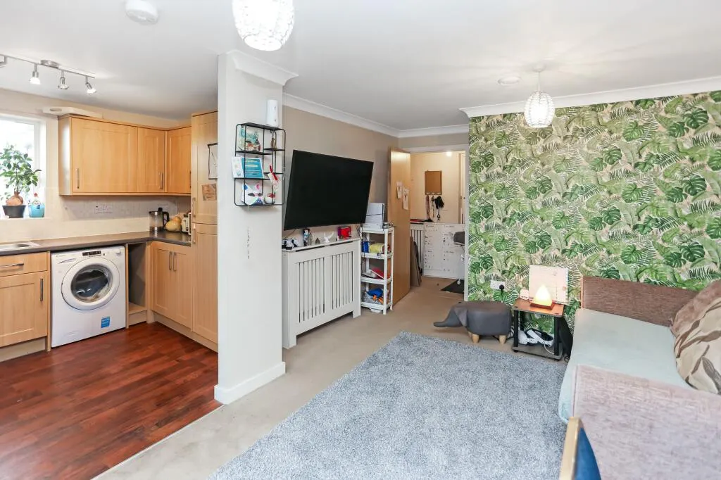 Inside, the apartment features two generous double bedrooms, both well-proportioned and ideal for comfortable living, guest accommodation or creating a practical work-from-home space. The heart of the home is the bright and sociable open-plan kitchen and living area, perfectly designed for modern lifestyles — whether entertaining friends, enjoying quiet evenings in, or maximising everyday living space.