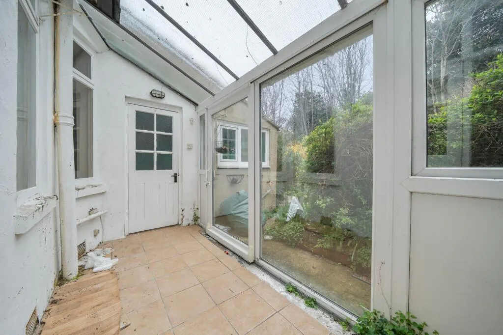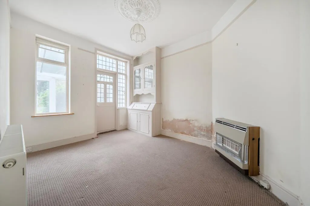 To the rear, the layout continues into a dedicated dining room that flows seamlessly into the kitchen. The kitchen itself is fitted with a range of wall and floor units and offers side access into the conservatory. This rear addition acts as a bridge between the interior and the garden, with access points from both the second reception room and the kitchen area.