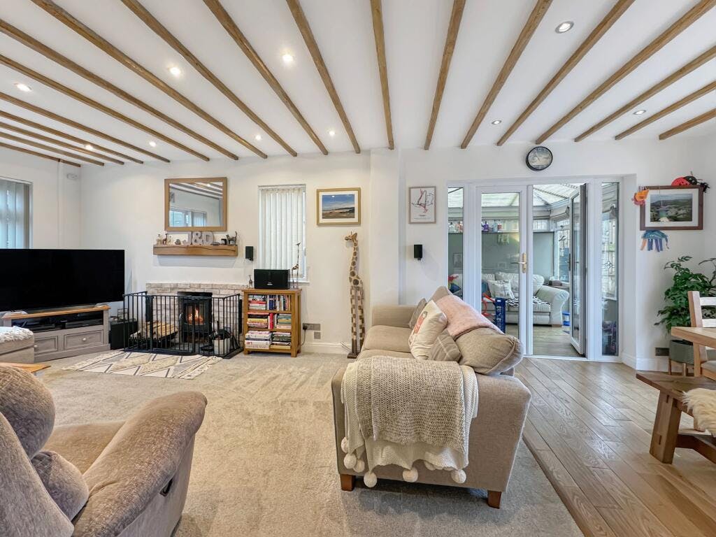 The heart of the home is the spacious living room, a warm and inviting space featuring exposed ceiling beams, recessed lighting and a wood-burning stove, creating a real focal point and a cosy atmosphere. This room flows naturally into the dining area and onward to the sun room, which provides a bright and relaxing space overlooking the garden and offers a seamless connection between indoor and outdoor living — particularly appealing given the property’s west-facing orientation, perfect for enjoying sunny afternoons and evening sunsets.