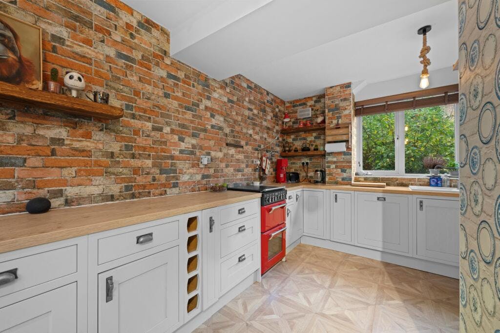 Accommodation comprises a generous entrance hallway with access to guest WC and stairs rising to the first floor, leading into the bright and spacious reception room with exposed brick feature wall, ample space for relaxing and entertaining, and doors to the raised terrace and garden beyond. The reception room opens through to the kitchen area, comprising a modern range of matching units with work surfaces, incorporating inset sink unit, gas hob, electric oven, and further integrated appliances. To the first floor, there are three well proportioned bedrooms – all with inbuilt storage- plus a family bathroom and separate WC.