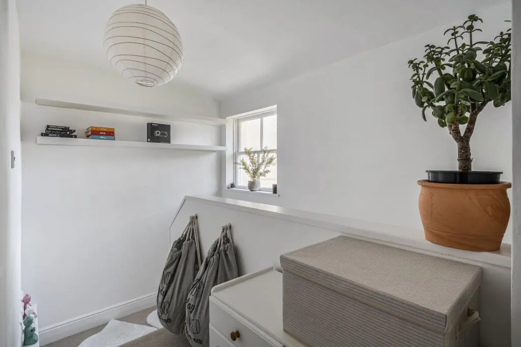 A rear hallway with overlooking garden window allows natural light to filter down into the lower level, where there’s a utility area for a washing machine and dryer.