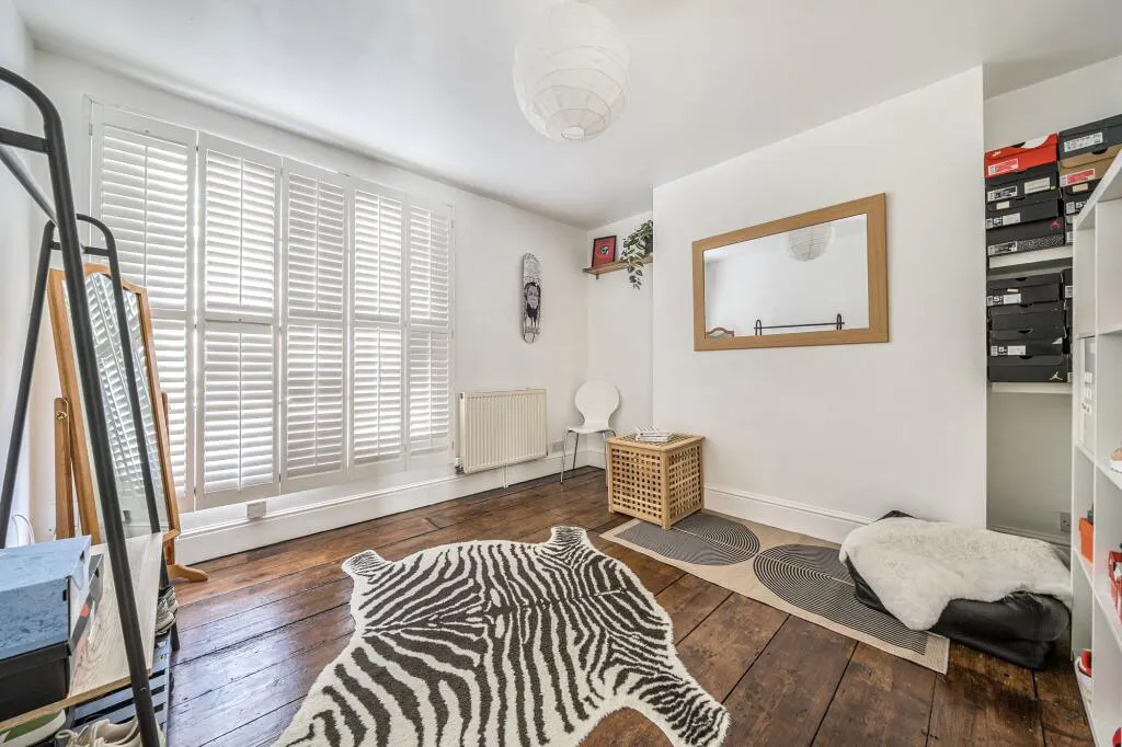 A generous double room featuring stained and varnished original floorboards, a tall sash window with white wooden shutters, and radiator.