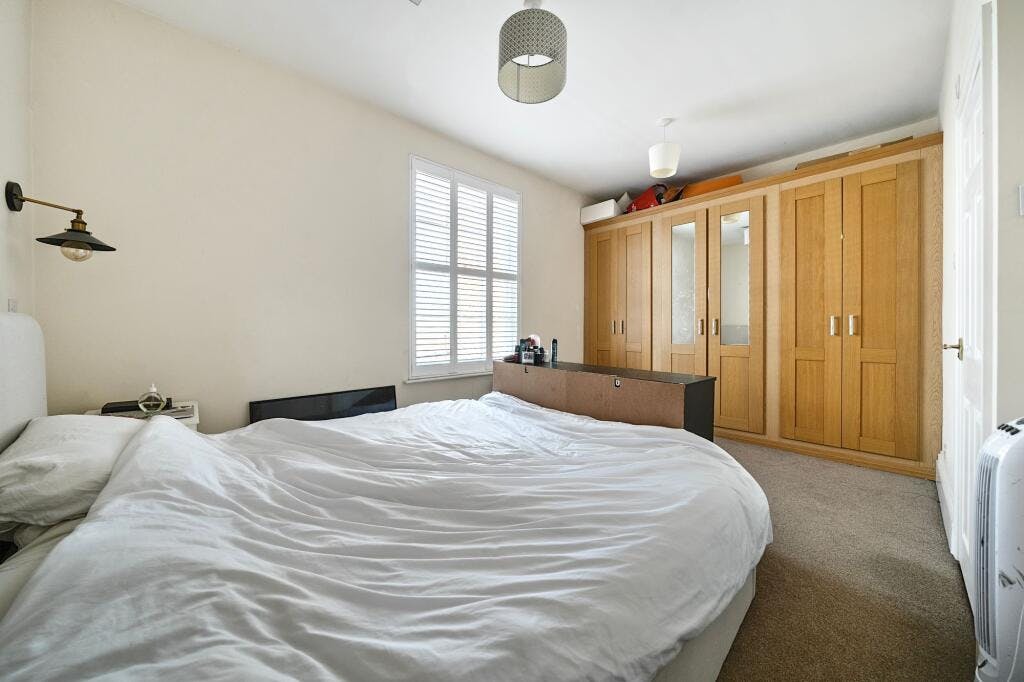 The top floor is home to a spacious and serene third double bedroom, which includes a built-in wardrobe access to the eaves and its own luxurious en-suite bathroom. This private retreat boasts a bathtub, basin, WC, and a flush-mounted TV — perfect for unwinding in comfort at the end of the day.