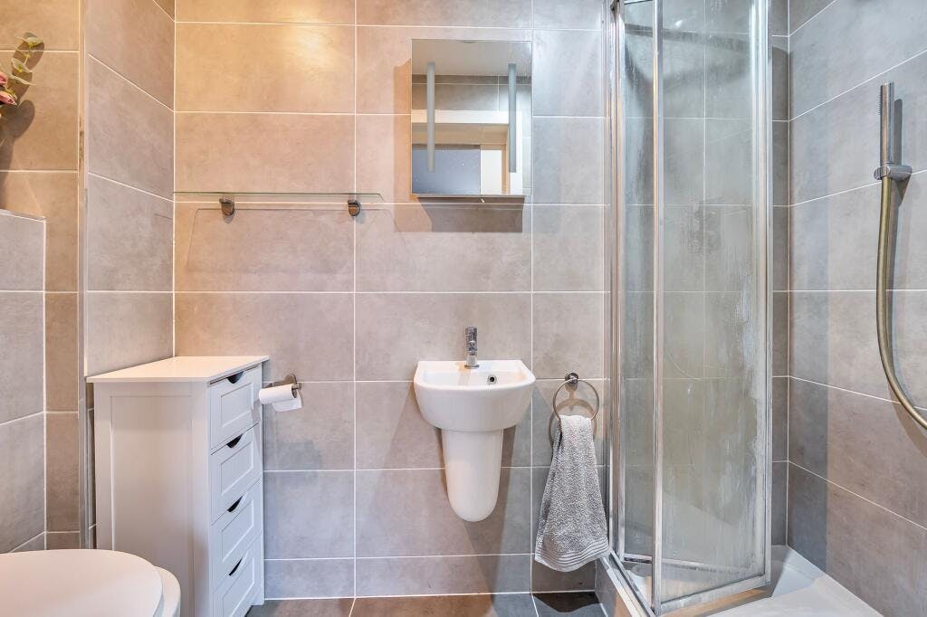 Both bedrooms are generous doubles, ideal for sharers or those who work from home and want the extra space. The master features its own sleek ensuite with a large enclosed shower, WC and basin, finished in contemporary tiling. The main bathroom doesn’t hold back either — complete with a bathtub, overhead shower, hand basin, WC and even a built-in TV so you can soak in the bubbles with a movie.
