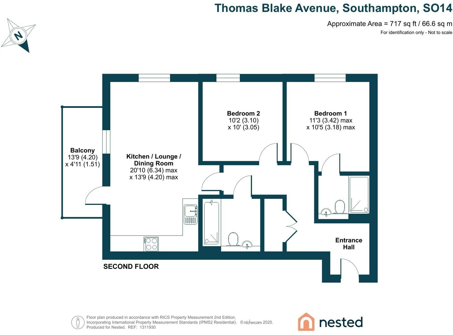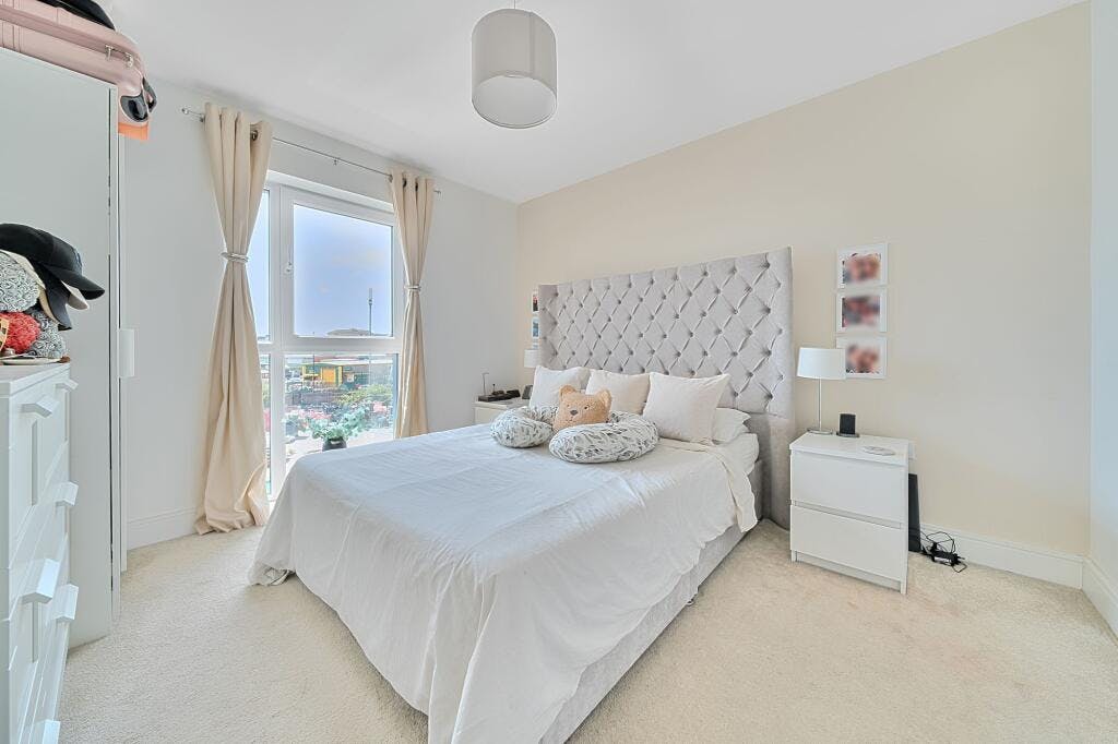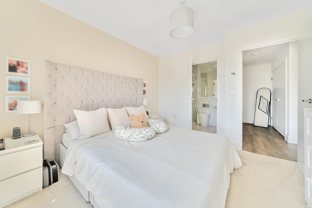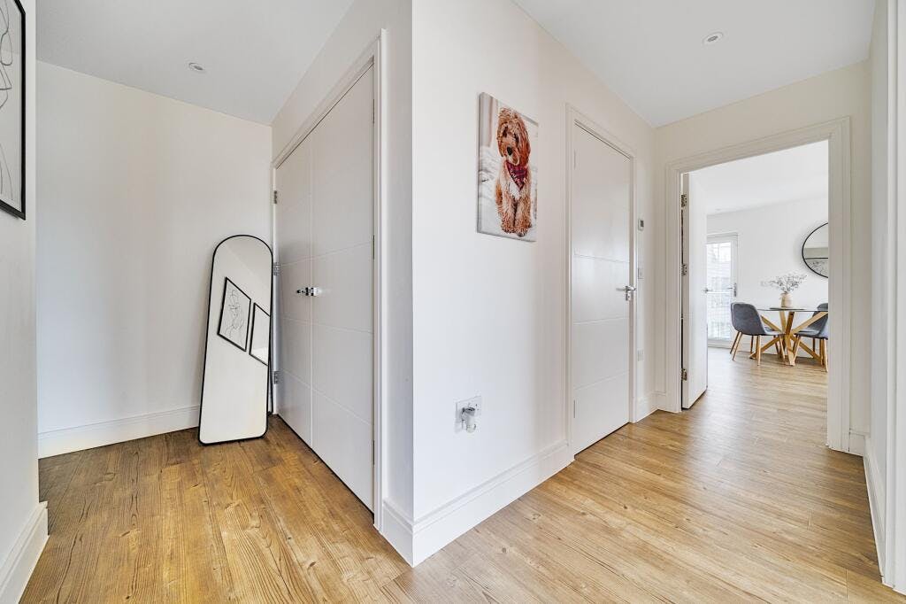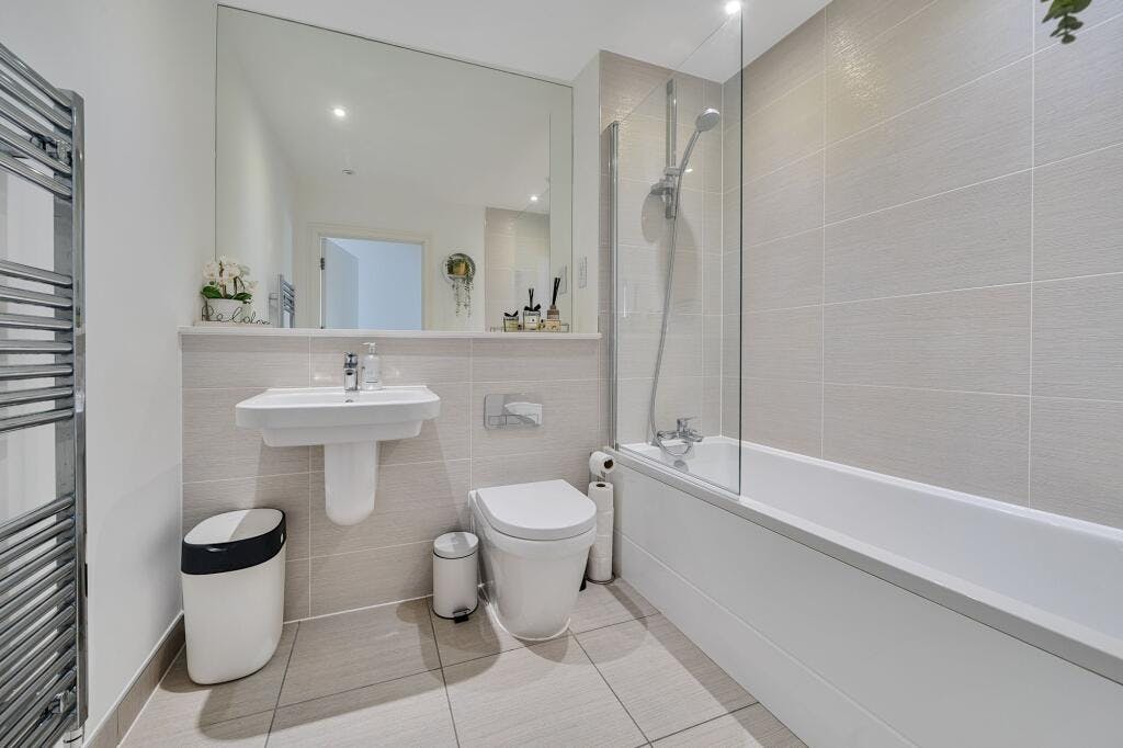 Inside, you’re welcomed by a bright, airy entrance hall with double doors opening to a handy storage cupboard. Both bedrooms are generous doubles, with the master boasting its own sleek en-suite. The en-suite and main bathroom are both light, modern, and contemporary, featuring heated towel rails, WC, hand basins, and smart partly tiled finishes. The en-suite is fitted with a spacious double shower, while the main bathroom includes a full-sized bath with an overhead shower—perfect for a relaxing soak or a quick refresh.