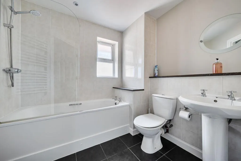 The main bathroom is finished in a clean, modern style with a bath and shower over, WC, and wash basin, along with tiled walls and flooring.