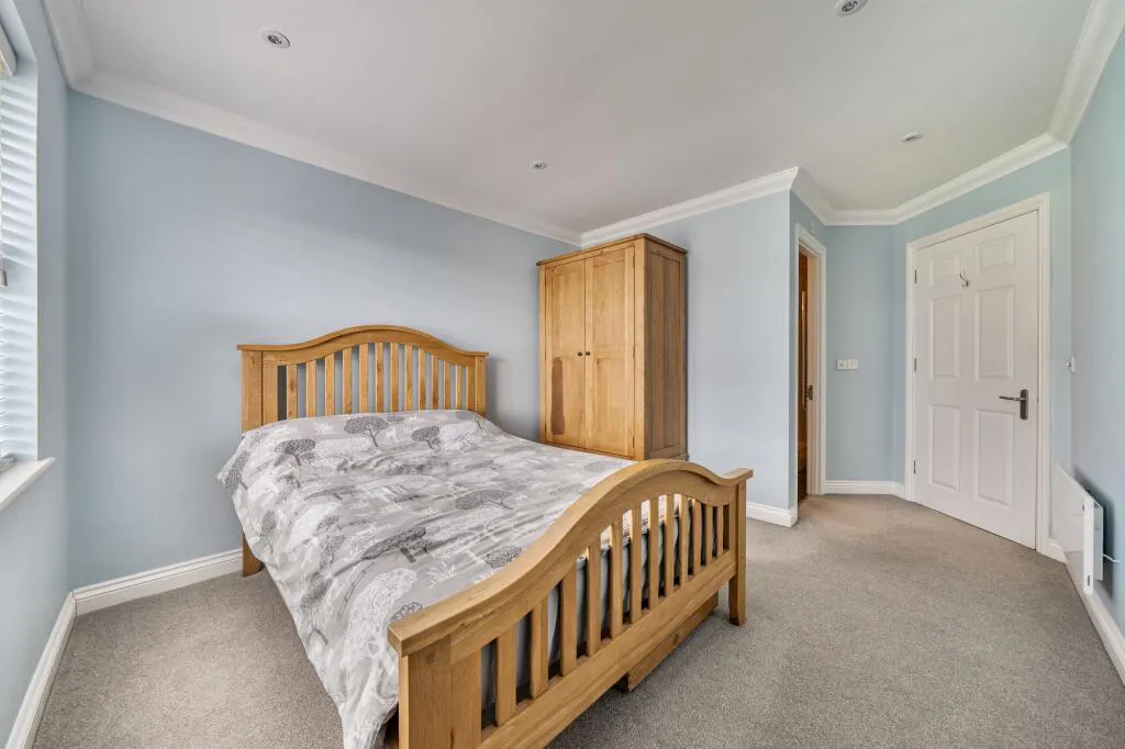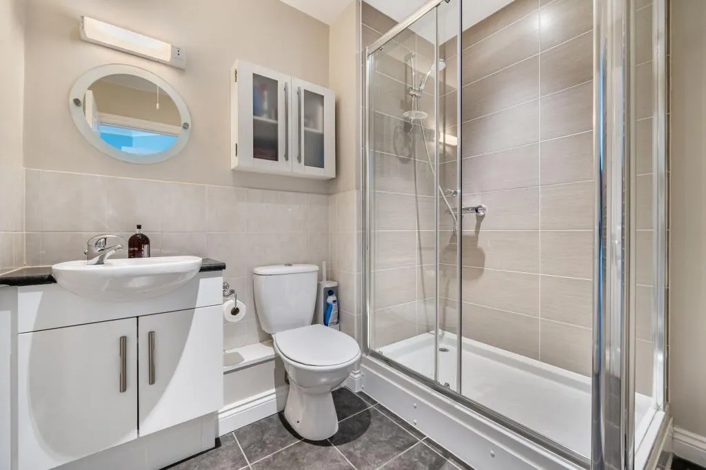 There are two well-proportioned double bedrooms. The main bedroom benefits from its own en suite shower room, complete with a double shower, WC, and vanity basin. The second double bedroom is versatile, ideal for guests, a child’s room, or a home office, depending on your needs.