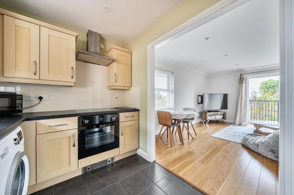The kitchen sits seamlessly within the living space, creating a sociable layout that works well for both day-to-day life and entertaining. It’s fitted with a range of wall and base units, tiled splashbacks, and includes everything you need, including a built-in oven, electric hob, extractor fan, and space for a fridge freezer, dishwasher, and washer dryer.