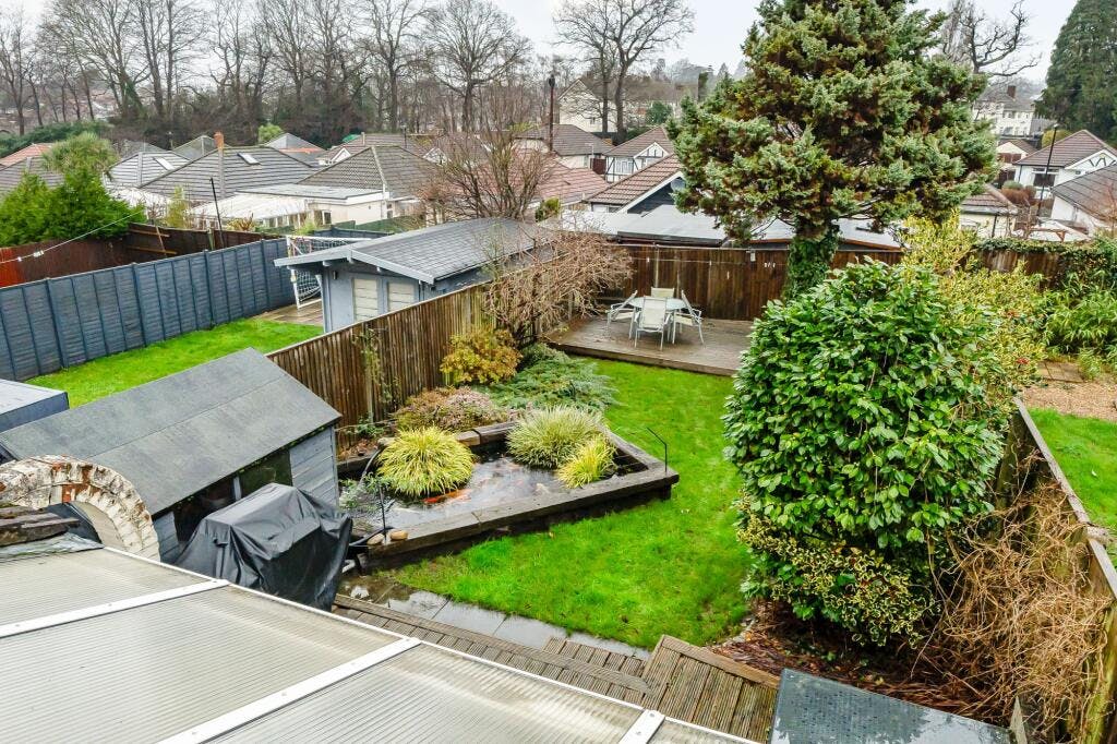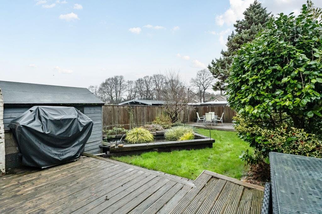 Outside, the rear garden has been designed with both privacy and practicality in mind. It’s fully enclosed, making it a safe space for children or pets, and includes a decked terrace ideal for outdoor dining or simply enjoying a quiet coffee. A lawn adds some greenery, and there’s a pond feature that adds a touch of character for those who enjoy outdoor life. The manageable size of the garden makes it easy to maintain, whether you’re a keen gardener or just want a peaceful retreat to unwind. The property also benefits from a garage, which is accessible from both the front and rear via double doors, and a separate door leading into the garden, offering additional storage, workshop potential or secure parking depending on your needs.