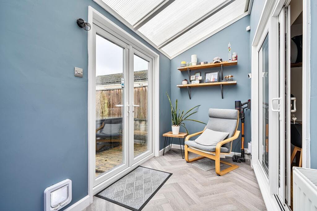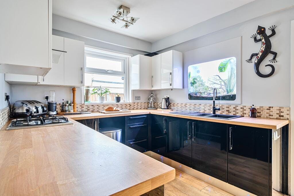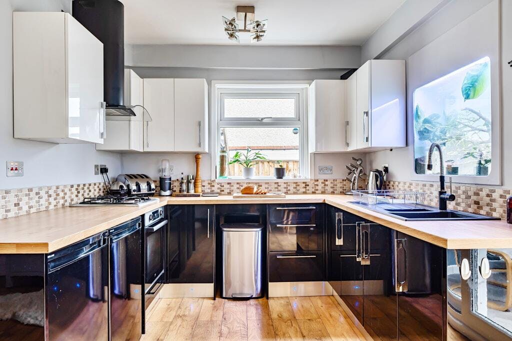 Set in a popular and well-connected residential area of Bitterne, this home offers a practical and welcoming layout from the moment you step through the front door. The entrance hall flows into a bright and open-plan living space, where the lounge is positioned at the front and framed by a bay window that brings in plenty of natural light. A stylish media wall creates a natural focal point for relaxing evenings or weekend movie nights, and the laminate flooring runs seamlessly into the dining area and kitchen, giving a sense of space and continuity. The kitchen has a modern finish, including under-unit LED lighting for added atmosphere, and features a sink with mixer tap and drainer, built-in electric oven, gas hob with extractor hood, and space for your chosen undercounter appliances. There's ample room for a family dining table, making everyday mealtimes or weekend entertaining easy and enjoyable. Sliding patio doors lead through to the conservatory – a handy, flexible extra space that could be used as a playroom, sunroom or home office – and French doors open directly onto the garden, letting the outside in during warmer months. A ground floor WC tucked off the conservatory adds everyday convenience, especially for busy families or when guests visit.