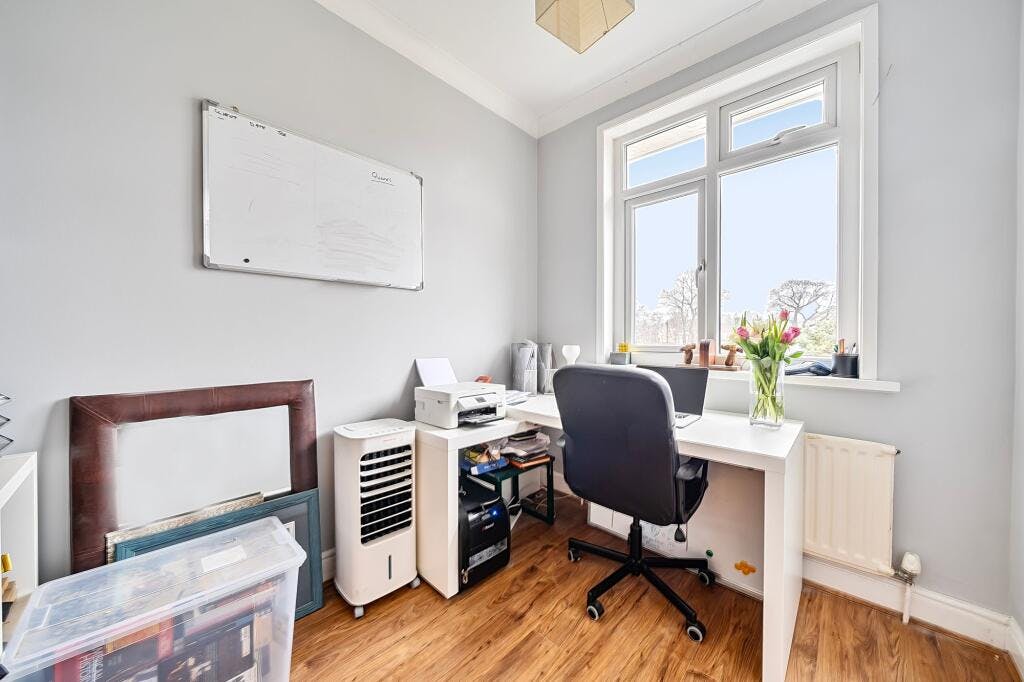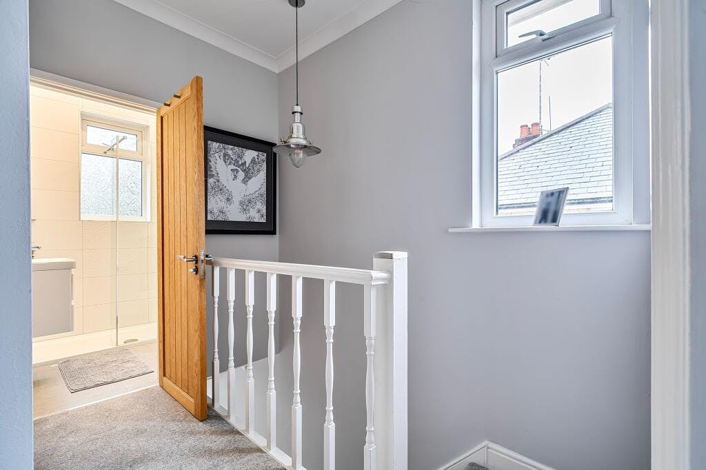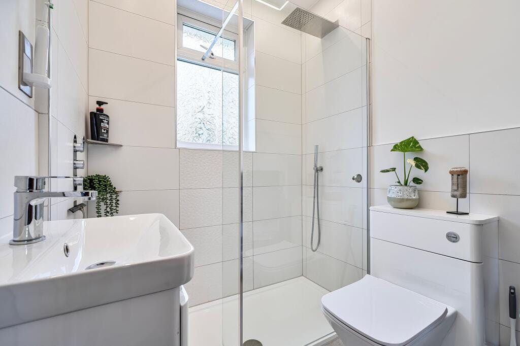 Upstairs, the bedrooms are all comfortably sized with two generous doubles that enjoy plenty of natural light and offer the flexibility to adapt as your needs change. The third bedroom is a larger-than-average single and would make a great nursery, child’s bedroom, or a dedicated workspace for remote working. The family bathroom has been thoughtfully updated and includes a large double shower enclosure with both overhead and handheld shower heads, perfect for quick mornings or relaxing evenings. A modern vanity unit with sink offers good storage space, paired with a matching WC, and the walls are smartly finished with stylish tiling for a clean, low-maintenance feel.