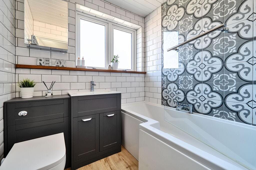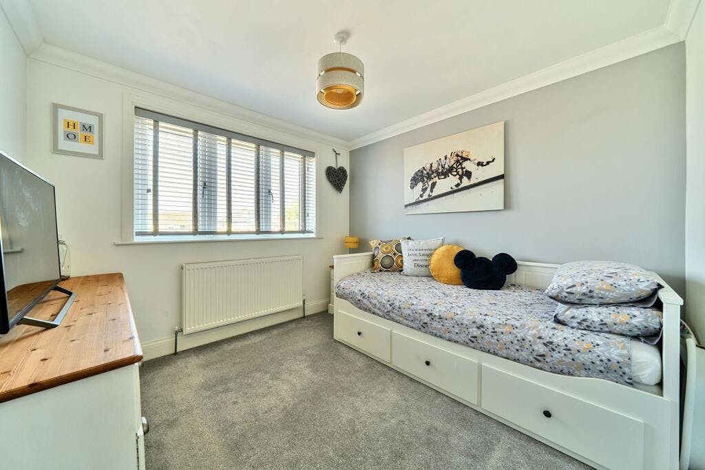 Upstairs are three comfortable bedrooms—two generous doubles and a third perfect as a guest room, office, or nursery. The family bathroom is clean and modern, featuring a bath with shower over plus a built-in vanity unit housing the toilet and hand basin complete this contemporary room. All are triple-glazed for maximum comfort
