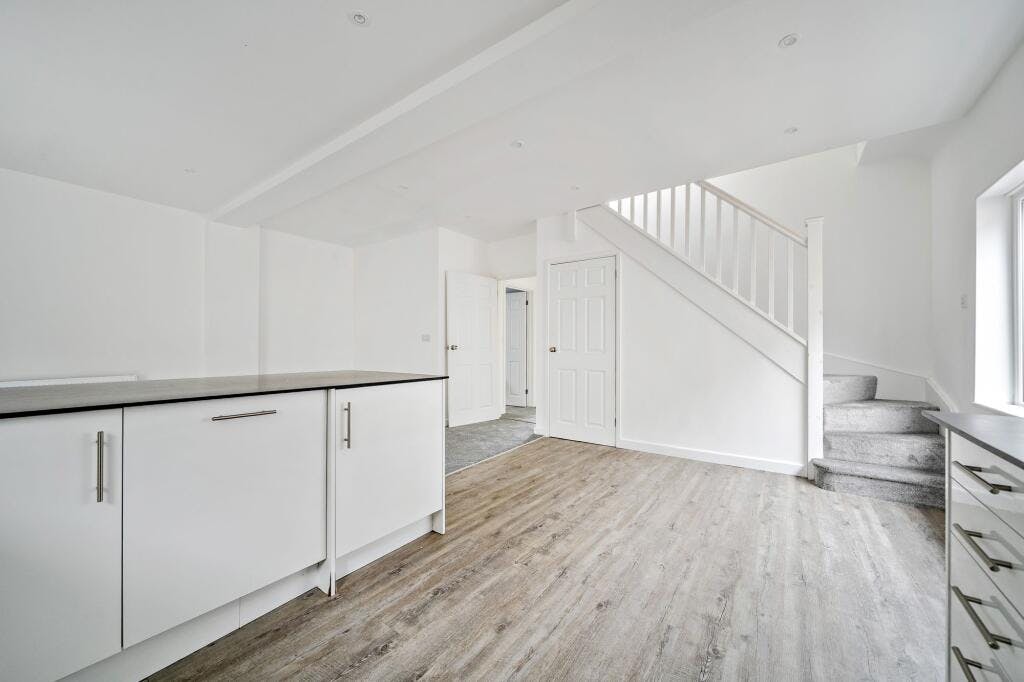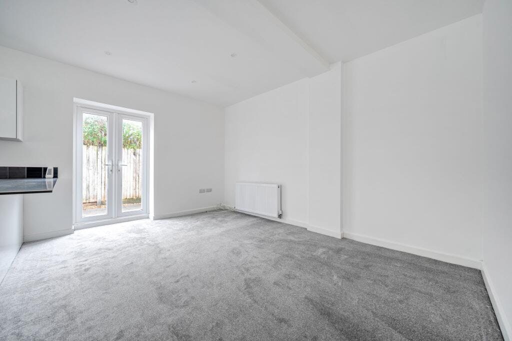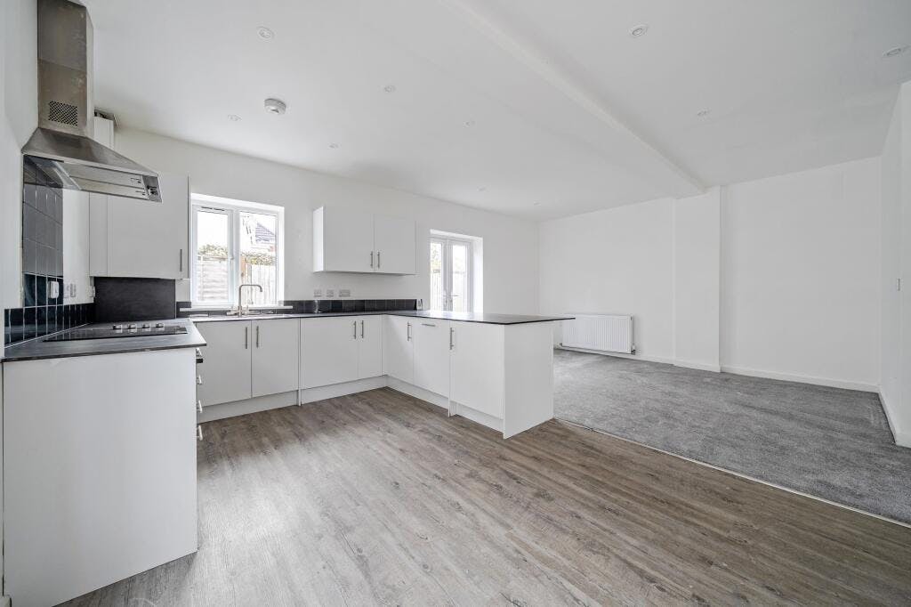 To the rear, the heart of the home is a stunning open-plan kitchen and living area. The kitchen is fitted with modern wall and base units, granite-effect worktops, and integrated appliances including a dishwasher and electric oven. Wood-effect flooring defines the kitchen space, while the living area is carpeted for comfort. French doors open onto the private garden, making it easy to enjoy summer evenings, weekend BBQs, or a quiet morning coffee outdoors.