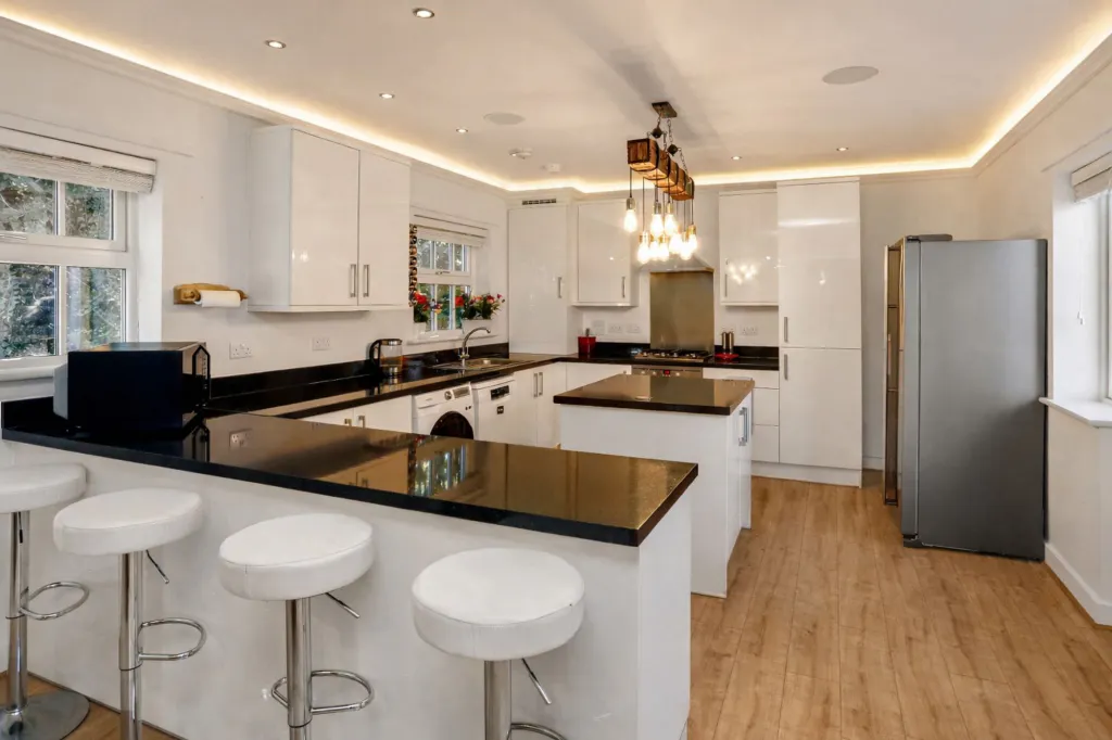 At the heart of the home is a striking 49 ft open-plan kitchen, dining and living space, designed for both everyday living and entertaining. A central island with breakfast bar and integrated power creates a natural focal point, while dual French doors open directly onto the garden, framing uninterrupted views across a mature tree copse and bringing the outdoors in.