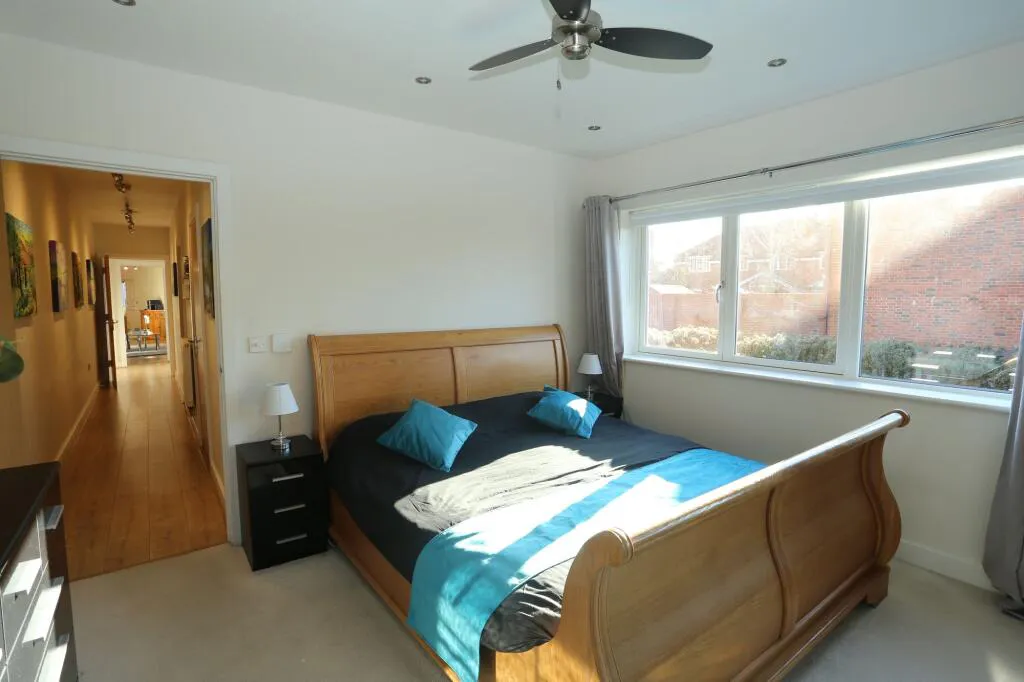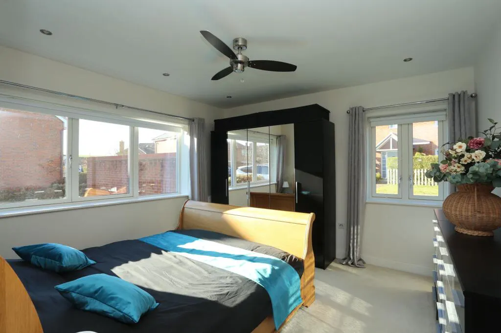Built to modern standards of insulation and energy efficiency, the home is as practical as it is stylish. A thoughtful winged layout separates bedrooms from the living area, ensuring privacy and quiet rest. The main bedroom is carpeted, while the remaining rooms feature low-maintenance laminate flooring. Extra-large windows with custom made Venetian blinds that fill the home with natural light, while ceiling fans, air conditioning and LPG central heating with a combi boiler provide year-round comfort.