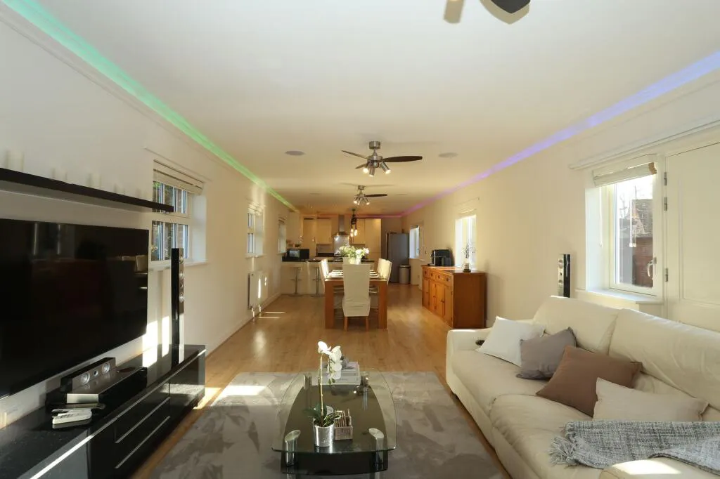 Modern smart features enhance everyday living. Energy-efficient recessed LED lighting is voice-controlled and dimmable, while a multi-zone in-ceiling sound system and RGB coving lighting set the mood indoors. Smart thermostats add efficiency with geofencing and open-window detection. For peace of mind, the home offers CCTV, a Ring Pro video doorbell, security lighting, a secure parcel box and an electric blackout blind in the lounge.