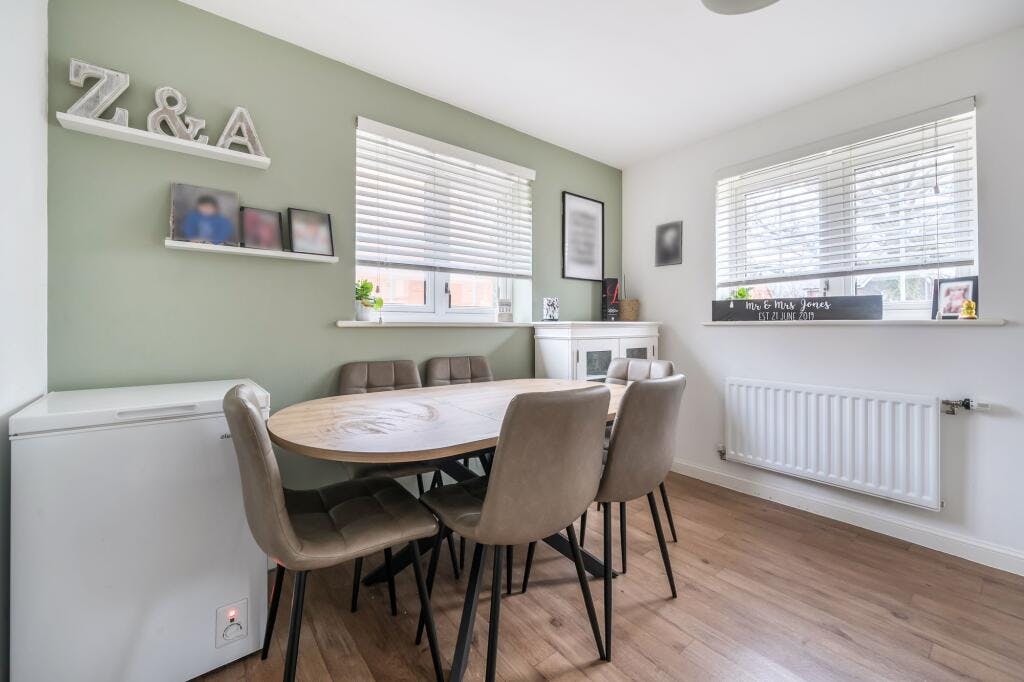 The ground floor welcomes you with a practical entrance hall, leading to a spacious kitchen diner on one side and a comfortable living room on the other. The kitchen diner is well arranged with a range of wall and base units, complemented by natural wood-effect work surfaces and white tiled splashbacks. It includes a stainless steel sink with drainer, an electric oven with gas hob and extractor hood, and space for a washer dryer and fridge freezer. The dining area enjoys windows to both the front and side elevations, creating a bright and sociable space for everyday meals or entertaining.