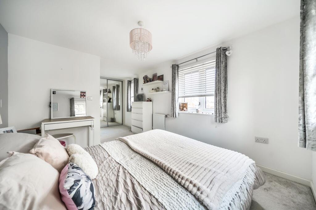 Upstairs, the first floor offers two generous double bedrooms. The main bedroom features a dressing area with built-in wardrobes and windows to the front and side elevations. The second double bedroom also enjoys dual-aspect windows, allowing plenty of natural light. The third bedroom is a versatile space, well suited as a home office, nursery, guest room, or child’s bedroom.
