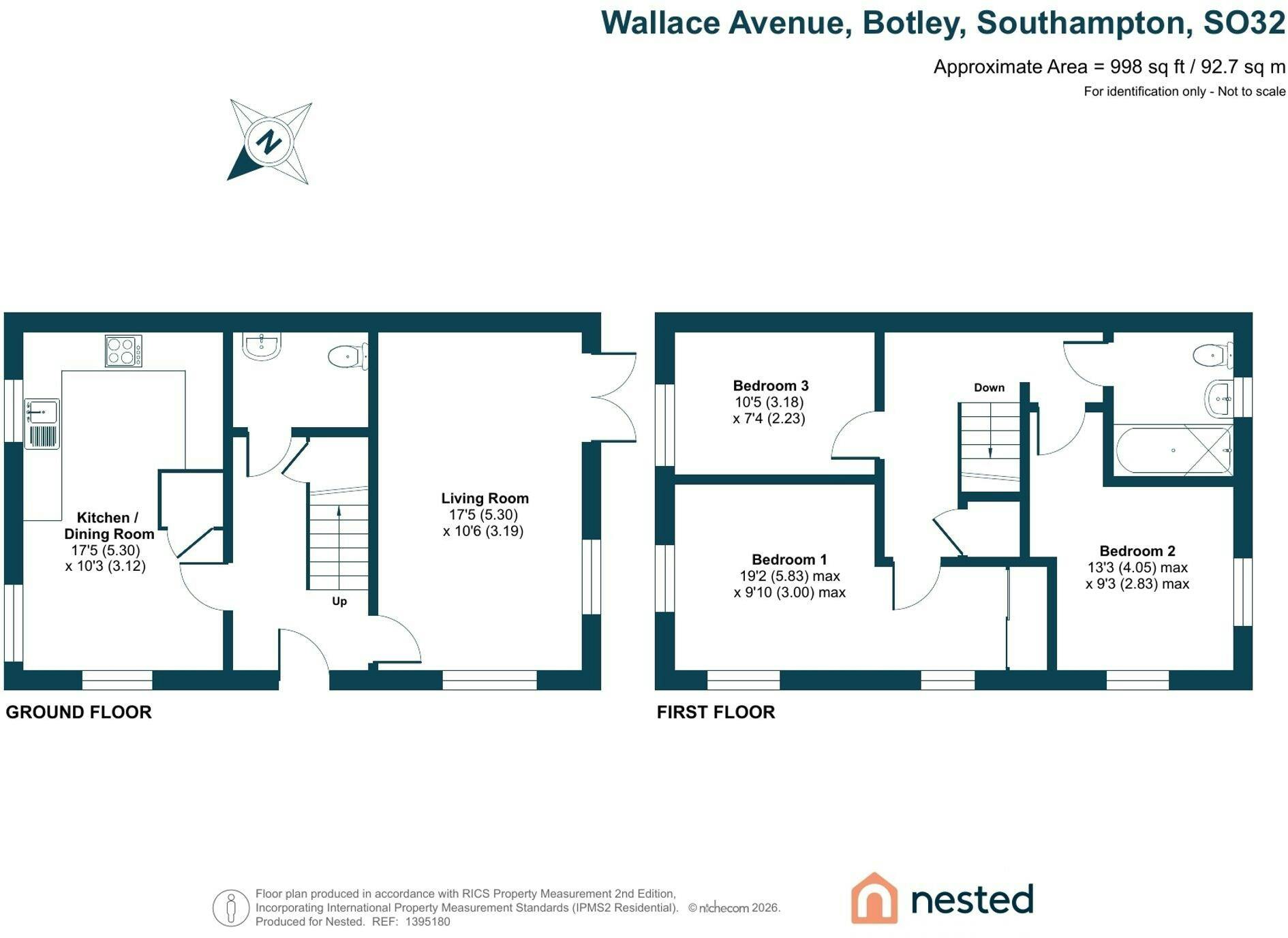 Upstairs, the first floor offers two generous double bedrooms. The main bedroom features a dressing area with built-in wardrobes and windows to the front and side elevations. The second double bedroom also enjoys dual-aspect windows, allowing plenty of natural light. The third bedroom is a versatile space, well suited as a home office, nursery, guest room, or child’s bedroom.