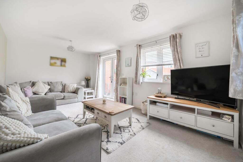 The living room is light and inviting, with windows to the front and side elevations and French doors opening onto the garden, making it an ideal space to relax or spend time with family.