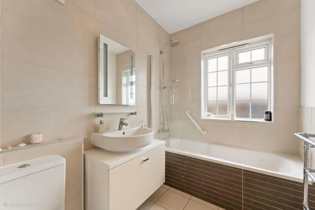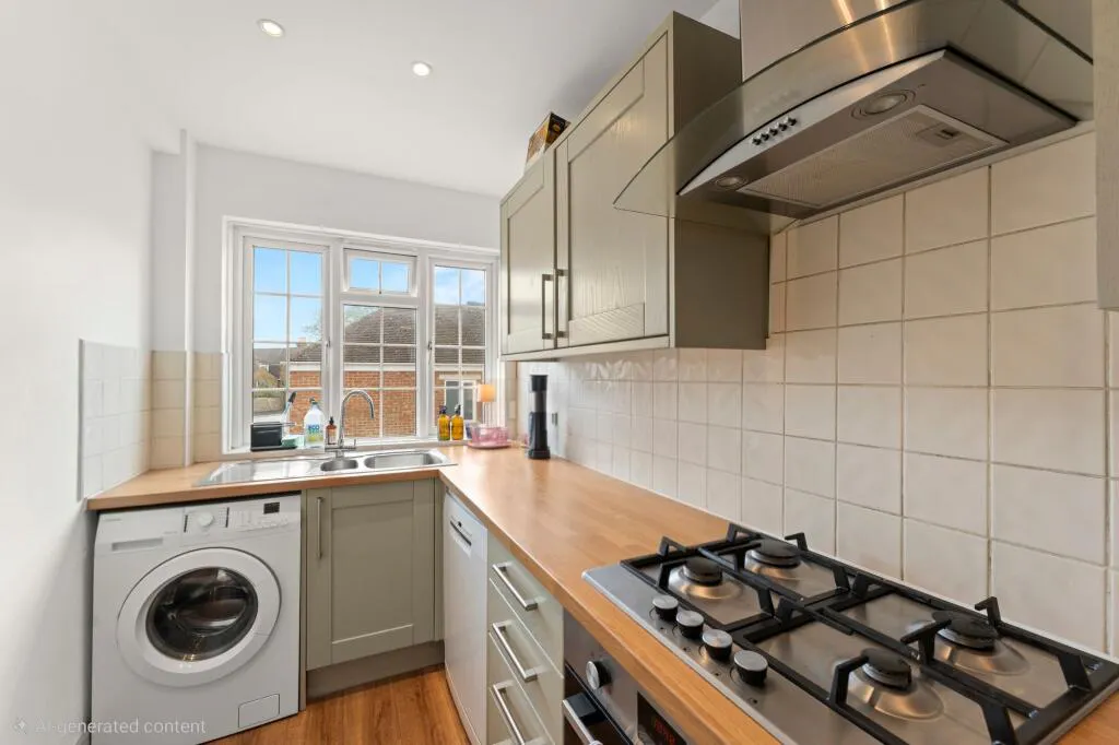 The kitchen is fitted with a range of modern wall and base units with worktops, inset sink, gas hob with extractor, oven, fridge/freezer, washing machine, dishwasher, and additional appliance space. The bathroom is finished with a stylish white three-piece suite and contemporary tiling.