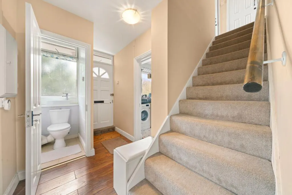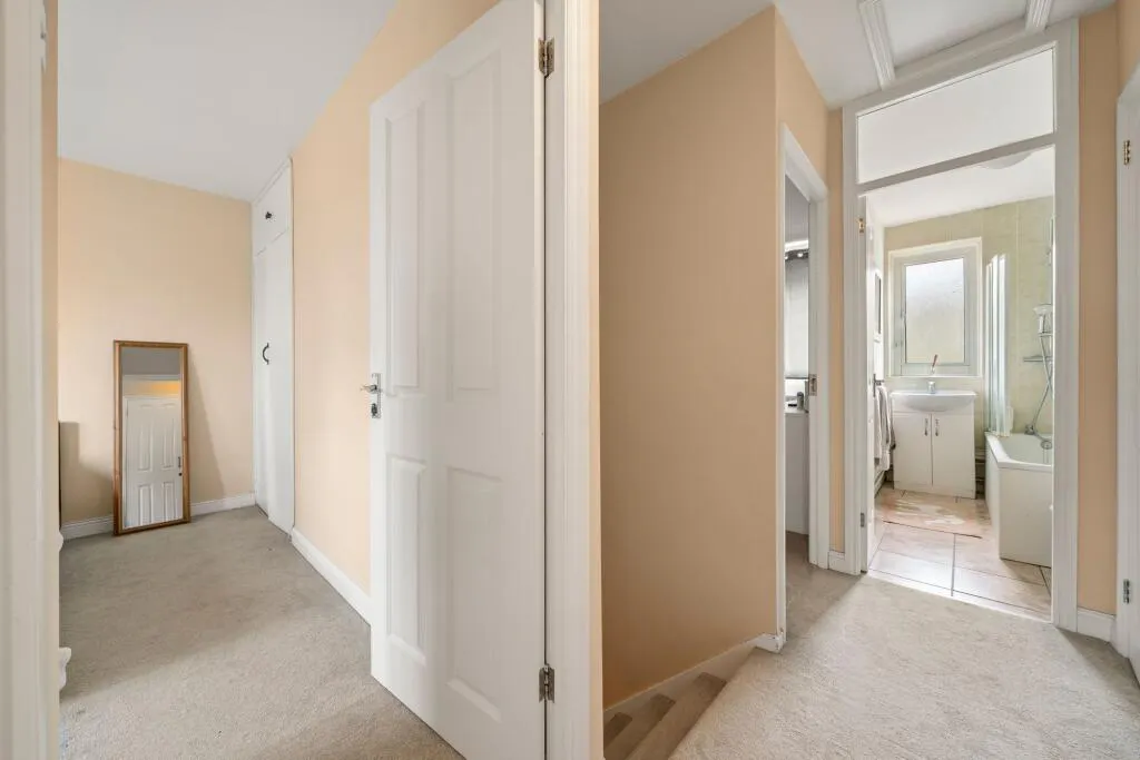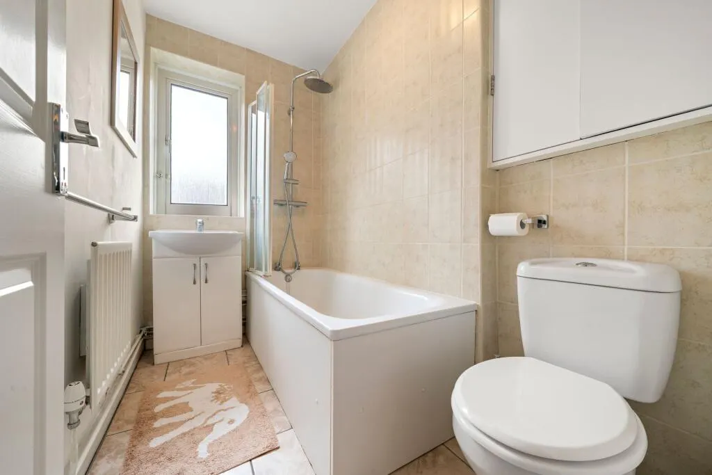 Upstairs, the principal bedroom benefits from built-in wardrobes, alongside a further double bedroom and a spacious single bedroom large enough to accommodate a double bed. A stylish family bathroom completes this level, featuring modern tiling and a classic white suite. Excellent storage is available throughout, including three large cupboards on the upper floor, as well as a boarded loft providing additional space.