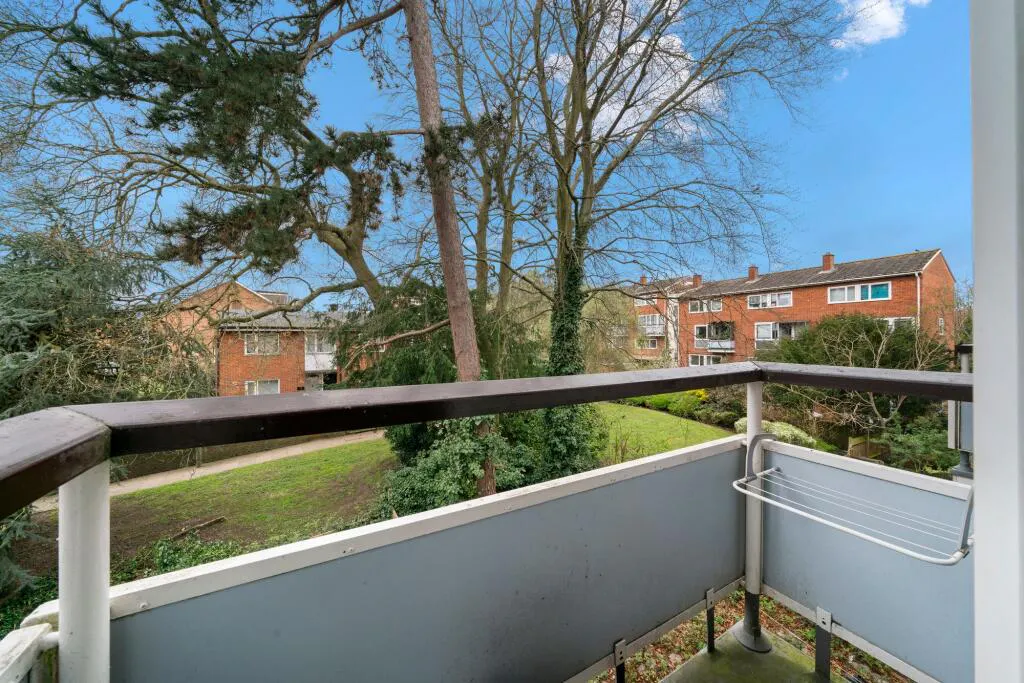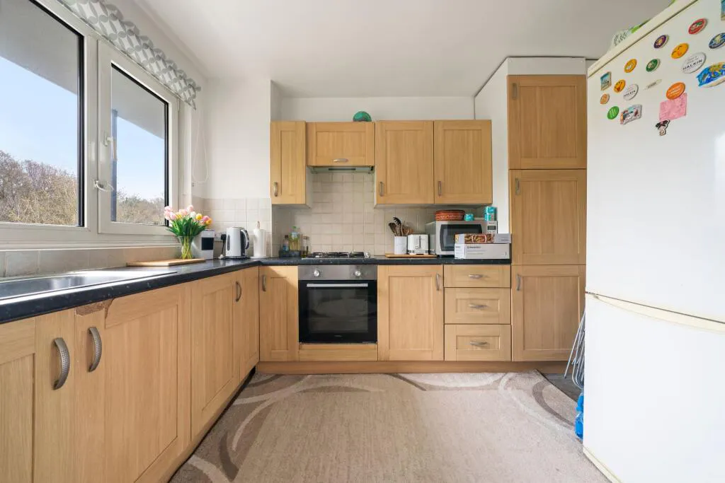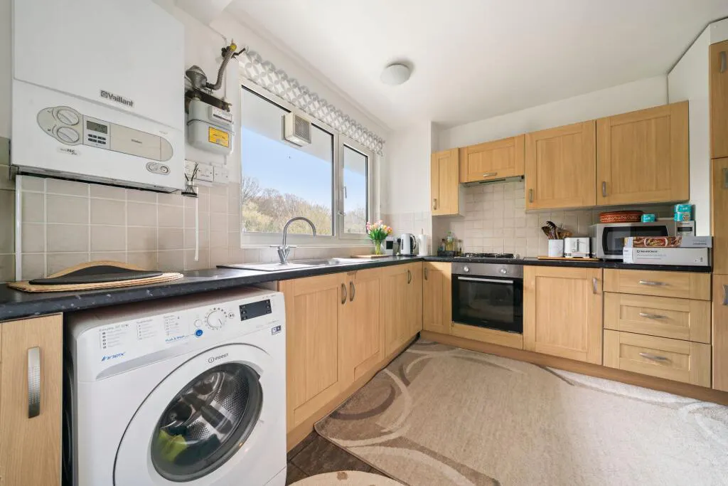 Situated on the third and fourth floors of a well-maintained development, the property opens into a welcoming entrance hall with a convenient guest WC. The modern kitchen is well-appointed with sleek units, contemporary worktops, a gas hob and oven, inset sink, and space for additional appliances. Adjacent, a generous reception room is flooded with natural light—ideal for both relaxing and entertaining—and provides direct access to a private balcony with a pleasant green outlook.