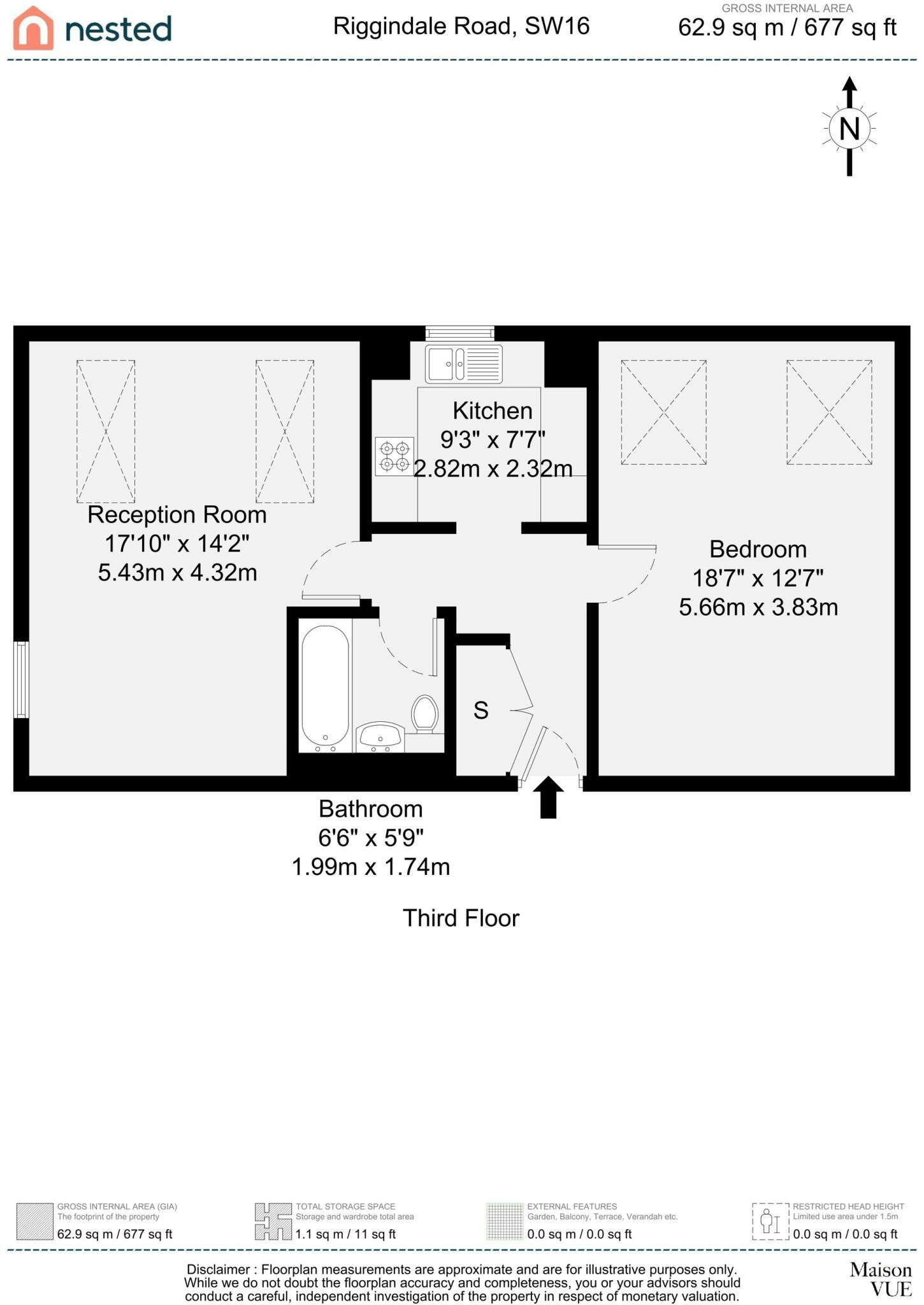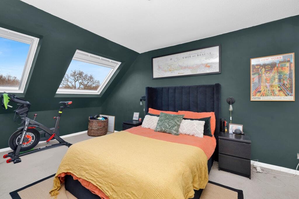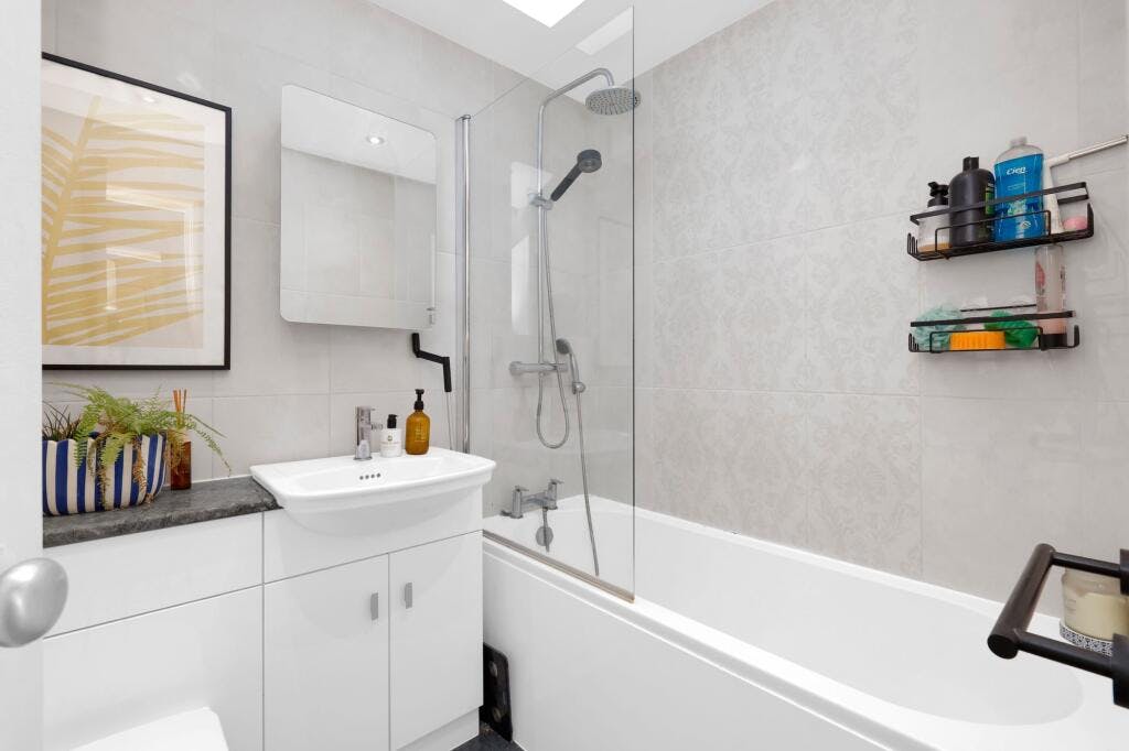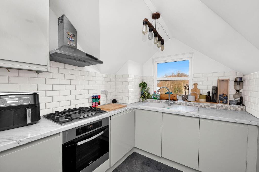 The accommodation comprises an entrance hall with large built-in storage, leading into a bright, dual-aspect reception room that offers excellent space for both living and dining. A separate modern fitted kitchen with integrated metro tiled splashback, and integrated appliances. The spacious double bedroom benefits from dual Velux windows, while the modern bathroom is finished with a contemporary suite and elegant tiling.