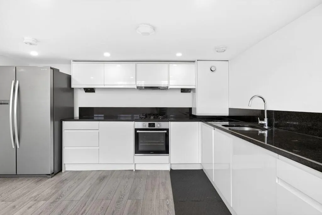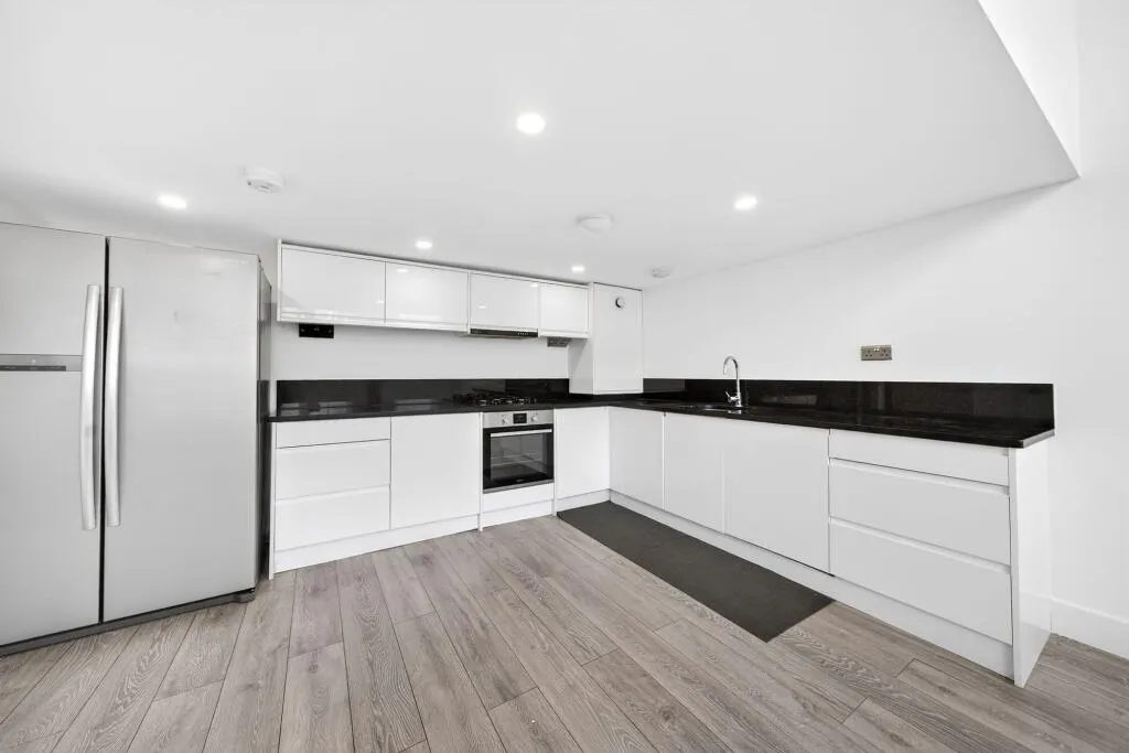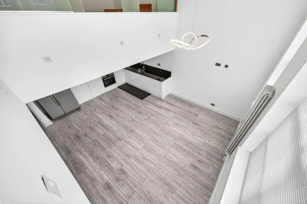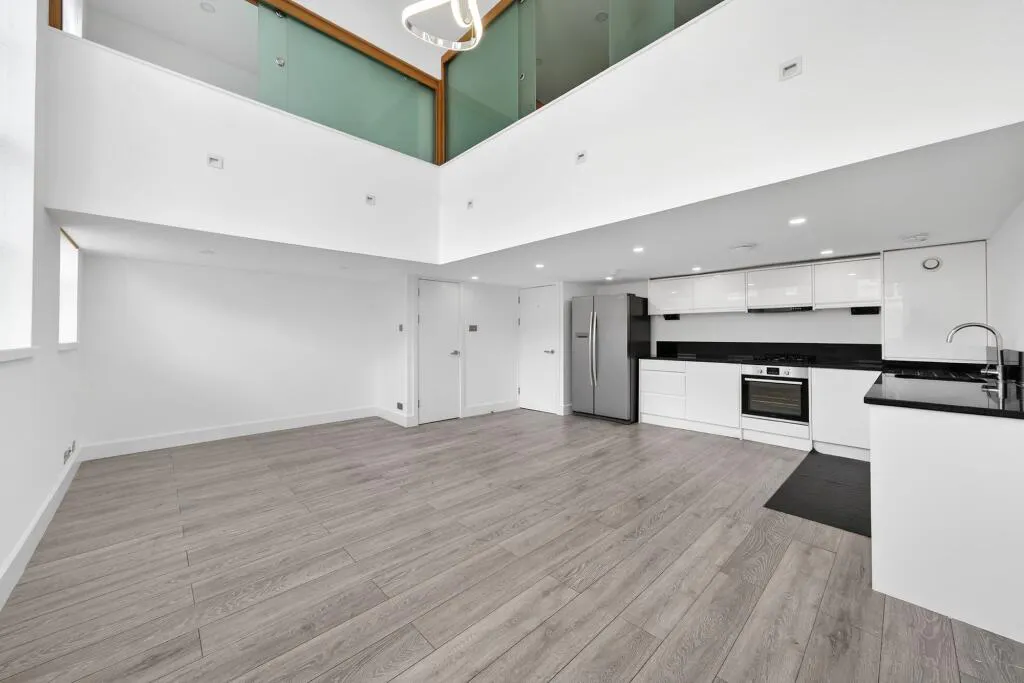 A standout feature is the striking open-plan kitchen/reception room, enhanced by double-height ceilings and large windows that flood the space with natural light and create a real sense of volume. The contemporary kitchen is well appointed with sleek cabinetry and generous worktop space, making it ideal for both everyday living and entertaining.