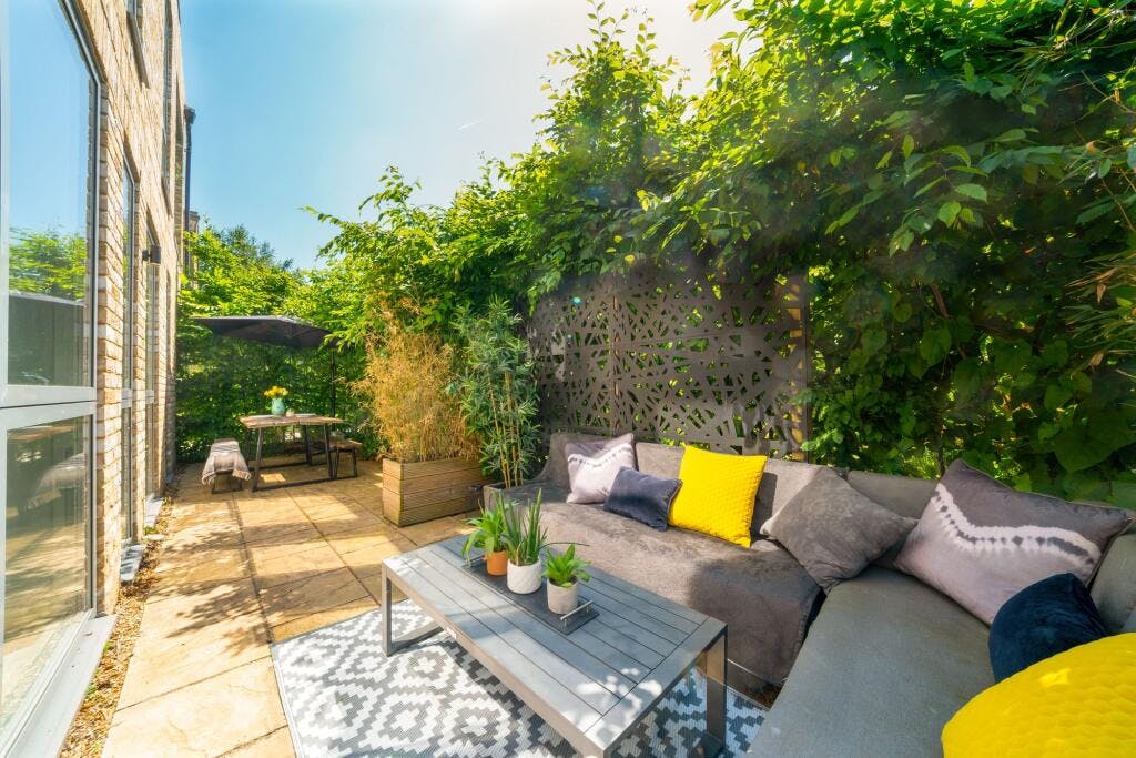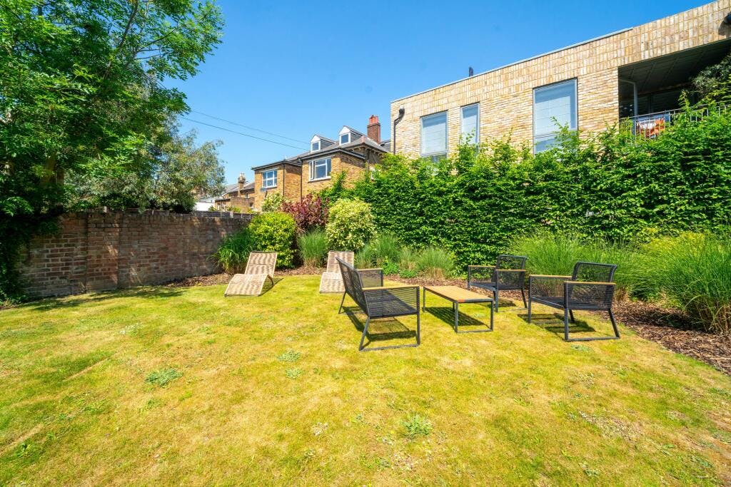 A designer led spacious ground floor south facing property with private entrance. On entering the sizeable hallway with home study area you are welcomed into a stylishly elegant open plan living space which is flooded with light. The Porcelanosa kitchen features integrated Bosch appliances with a dining area overlooking the side garden. The sitting area exudes contemporary chic and features full height windows and door to access the external patio. A wonderful south facing entertaining patio is perfect for alfresco dining, with sitting/ relaxation area and side garden for a variety of uses, perfect for a BBQ, growing plants or vegetables. This private space overlooks the manicured communal garden.