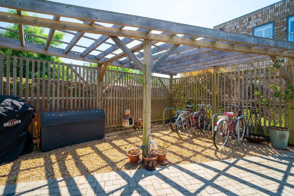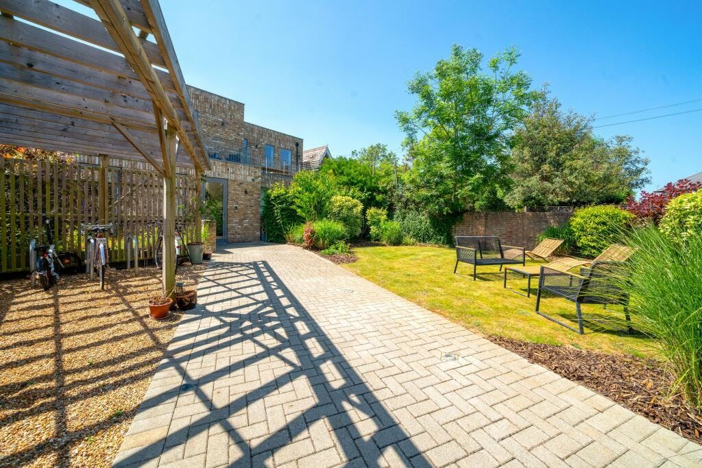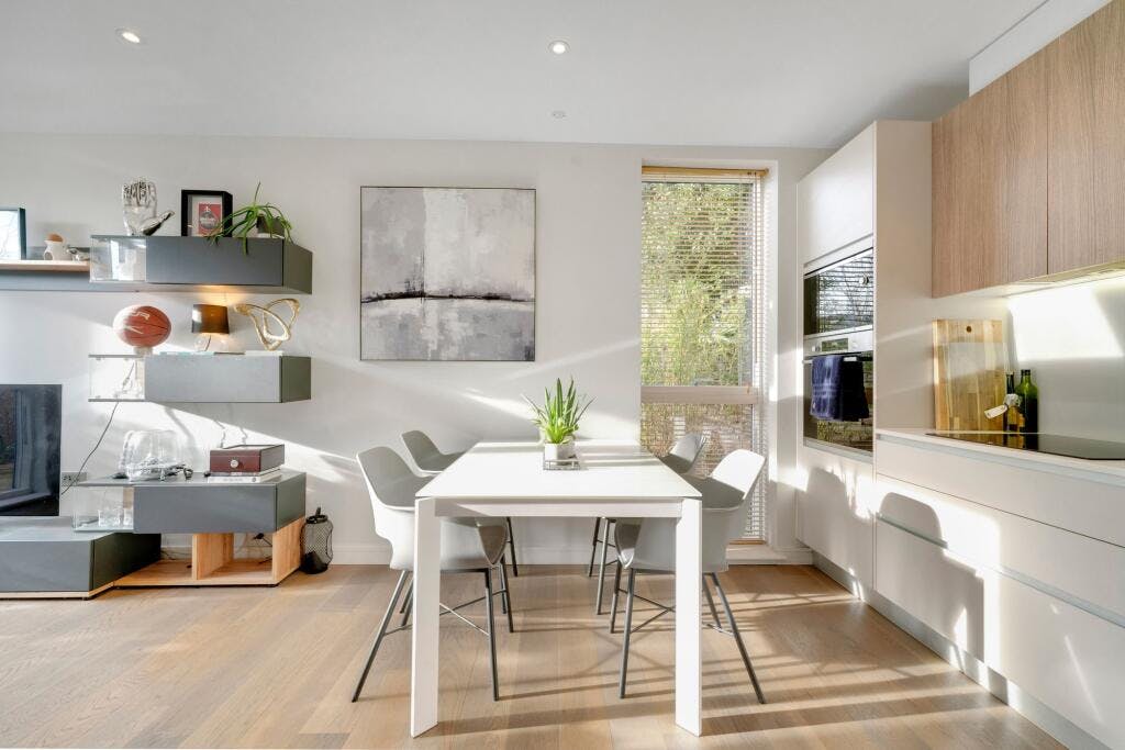 Internally this sleek apartment offers two double bedrooms, both offering privacy and overlooking the patio and gardens. The luxurious tiled Porcelanosa bathroom features both a shower and bath. Adjacent is a utility cupboard with washer/dryer, storage and boiler servicing the underfloor heating and bedroom radiators. Brushed slate oiled oak flooring runs seamlessly throughout the living space, with contemporary carpets to the bedrooms, and contemporary design aluminium windows.
