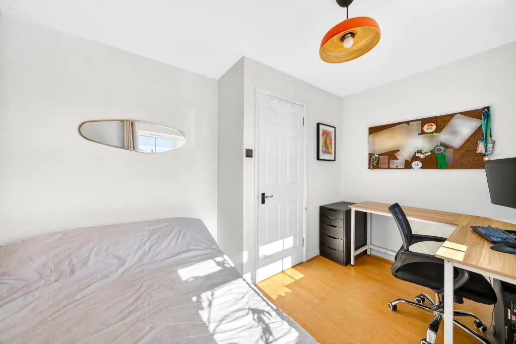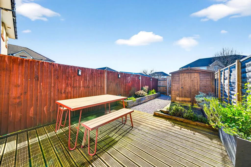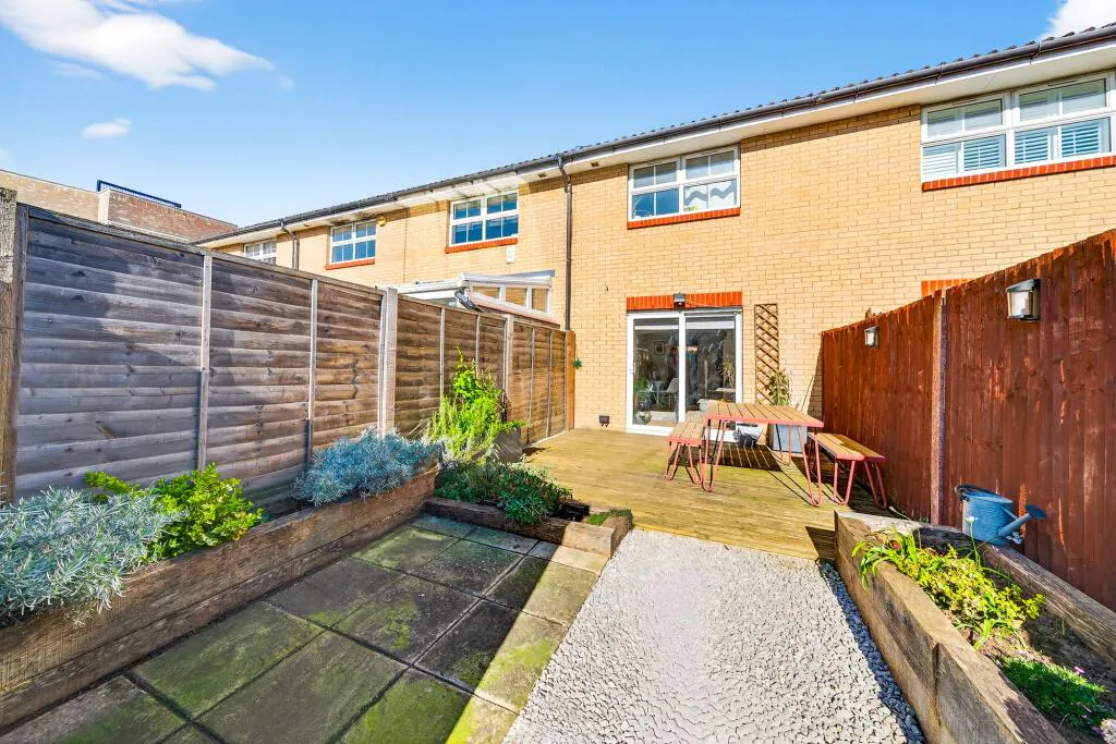 The rear garden is a real feature of the property, offering a low-maintenance outdoor space with decked seating, planted borders and a garden shed. The house also benefits from an allocated parking space.