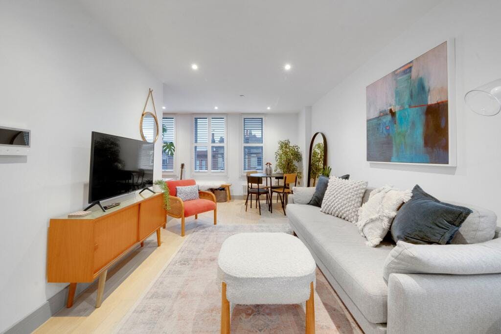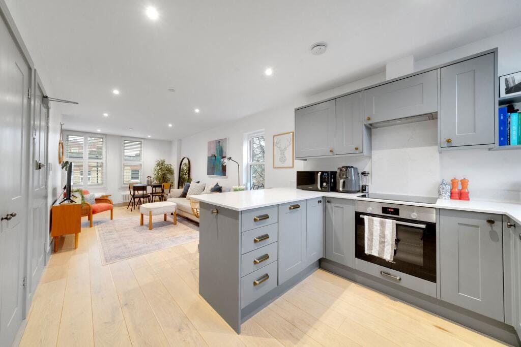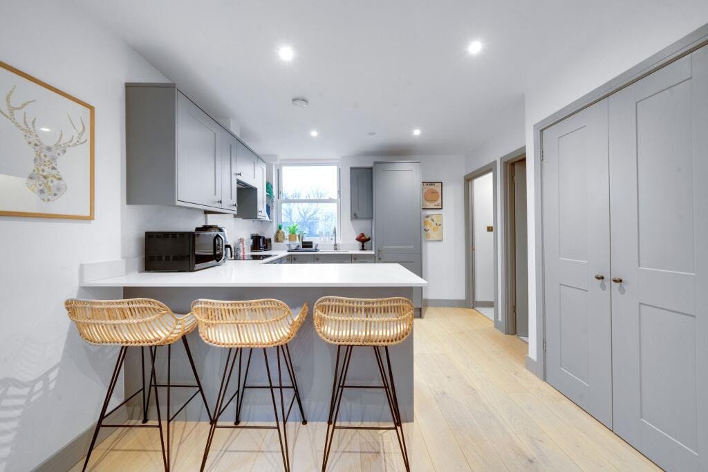 Step into the open-plan kitchen and reception area, adorned with exquisite engineered oak wood flooring and a sleek Chelford Slate Grey kitchen. The kitchen features integrated Bosch appliances and Quartz counter tops.